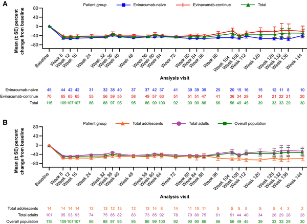Per cent and absolute change from baseline in LDL-C, as well as other lipid and lipoprotein parameters, were summarized using descriptive statistics. Per cent and absolute change from baseline in LDL-C were analysed by evinacumab treatment status (evinacumab-naïve and evinacumab-continue) and age (adults and adolescents) up to Week 184. At Week 24, per cent and absolute change from baseline in LDL-C were assessed by age, sex, race, LDLR genotype (null–null and non-null), lipoprotein apheresis status, triple therapy status, and quadruple therapy status at baseline. For patients who had received evinacumab in the previous Phase 2 study or who had not previously received evinacumab, baseline was defined as the last obtained value before the first dose of evinacumab in this open-label study. For patients who had previously received evinacumab in the pivotal Phase 3 study, baseline was defined as the last obtained value before the first dose of double-blind evinacumab in the Phase 3 study. Triple therapy was defined as treatment with a statin, ezetimibe, and a PCSK9 inhibitor, and quadruple therapy was defined as treatment with a statin, ezetimibe, a PCSK9 inhibitor, and lomitapide. Note that the subgroups indicated do not exclude the use of other concomitant LLTs (e.g. bile acid sequestrants, nicotinic acid and derivatives, phytosterols, probucol, and omega-fatty acids). Per cent change from baseline in other lipid and lipoprotein parameters was assessed in the overall population, and by evinacumab treatment status, at Week 24. Missing data were not imputed. All statistical analyses were performed using SAS Linux 9.4 (SAS Institute, Cary, NC, USA).