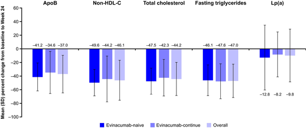 Evinacumab concomitantly decreased Apo B, non-HDL-C, total cholesterol, fasting triglycerides, and Lp(a) at Week 24 and this remained stable until at least Week 120. Lp(a) levels are frequently elevated in patients with HoFH and are associated with an increased risk of adverse cardiovascular outcomes., Thus, a reduction in Lp(a) might provide ASCVD benefit; however, this finding requires further verification in large clinical outcome trials.
