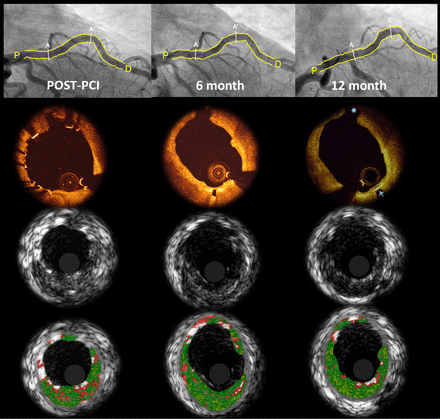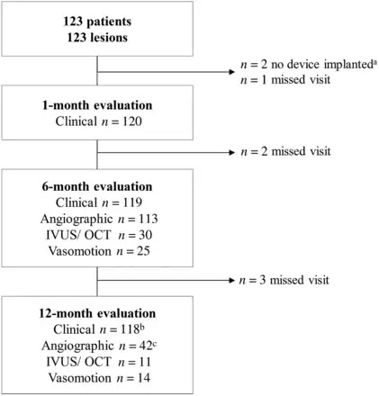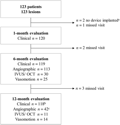 Clinical follow-up was planned at 1, 6, 12, 24, and 36 months. Angiographic follow-up was scheduled at 6 months for all patients, an additional pre-specified imaging follow-up was scheduled at 12 months if subjects consented. A subgroup of 30 patients underwent intravascular ultrasound (IVUS), optical coherence tomography (OCT), and vasomotion testing at 6 months. At this time point, these patients were also asked to consent for voluntary IVUS, OCT, and vasomotion assessment at 12 months. Only patients without target lesion revascularization (TLR) were asked for additional 12-month imaging assessment.