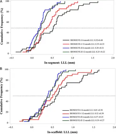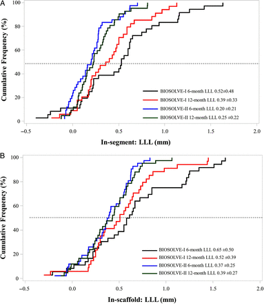 Cumulative frequency curves for in-segment (A) and in-scaffold (B) late lumen loss. Six- and twelve-month serial analysis of late lumen loss observed in BIOSOLVE-II compared with BIOSOLVE-I using the precursor device DREAMS first generation.