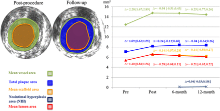 Serial changes of intravascular ultrasound parameters in 11 patients. Only a very small neo-intimal hyperplasia area is visible (7 o'clock). Δ indicates the difference between follow-ups in mm2 [95% CI].