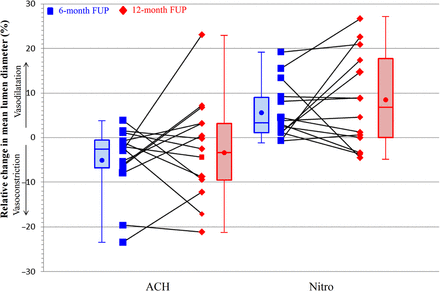 Serial vasomotion at 6 and 12 months was tested in 14 patients; thereof 11 (79%) had a change of >3% to the mean lumen diameter after infusion or injection of acetylcholine (Figure 5). The median percentage change in mean lumen diameter between pre-and post-acetylcholine was −2.6% (IQR: −6.4 to −0.6%, mean −5.1 ± 7.7%) at 6 months and −3.4% (IQR: −9.4 to 3.2%, mean −3.4 ± 11.0%) at 12 months; the percentage change in mean lumen diameter between post-acetylcholine and nitroglycerine was 3.4% (IQR: 1.1–9.2%, mean 5.8 ± 6.4%) and 6.7% (IQR: 0.0–17.4%, mean 8.2 ± 10.6%), respectively.