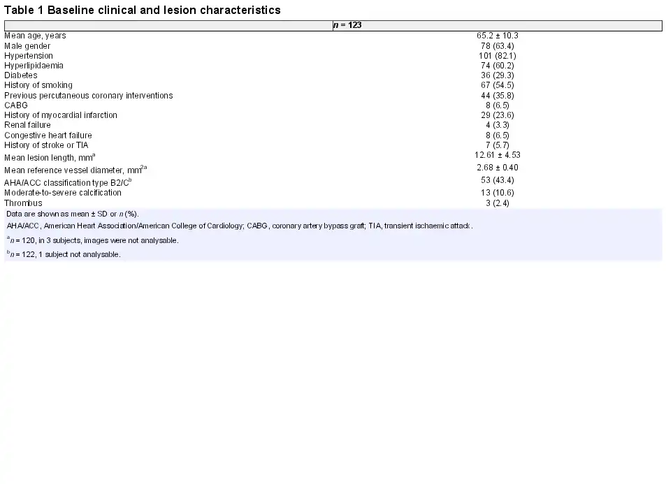 Eligible patients had stable or unstable angina or documented silent ischaemia, a maximum of two single de novo lesions in two separate coronary arteries, with a reference vessel diameter between 2.2 and 3.7 mm, a lesion length of ≤21 mm, and a diameter stenosis between 50 and 99%. Exclusion criteria included thrombus in the target vessel, severe calcification, three-vessel disease, ostial lesion, bifurcation lesion involving a side branch >2.0 mm in diameter, target lesion located in or supplied by an arterial or venous bypass graft, and unsuccessful pre-dilatation. The full list of inclusion and exclusion criteria can be accessed at clinicaltrials.gov (NCT01960504).