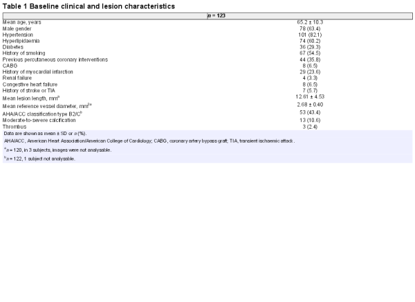 Between October 2013 and May 2015, 123 subjects were enrolled. Clinical follow-up at 12 months was 98% (Figure 1). Baseline parameters are listed in Table 1. A comparison of baseline parameters of the angiographic and IVUS/OCT subgroups with serial 6- and 12-month evaluation compared with the overall population is provided in the Supplementary material online, Table S1. In two lesions, DREAMS 2G could not be implanted due to insufficient pre-dilatation; follow-up of these two subjects was consequently not included in this analysis.