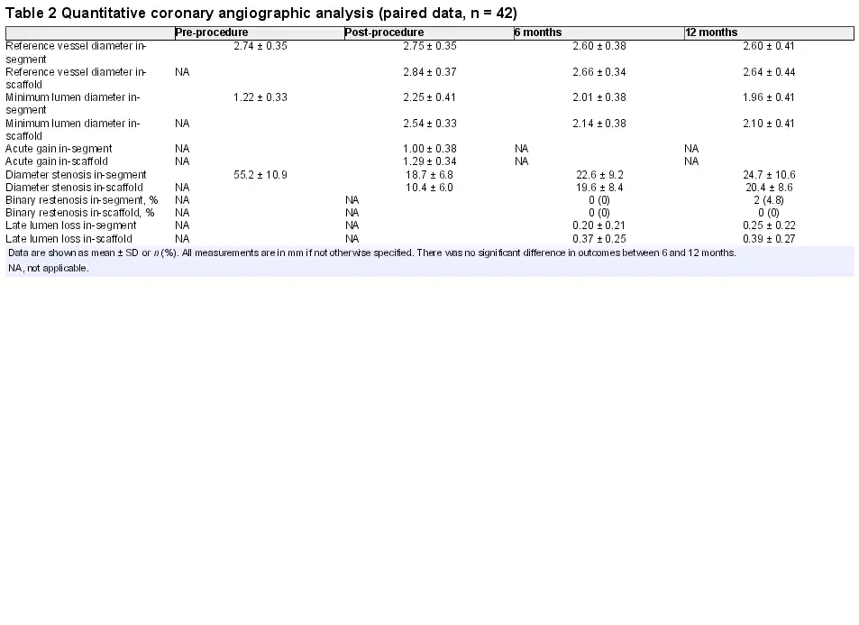 The clinical follow-up rate was high, but—attributed to the fact that it was voluntary per protocol—only a relatively small cohort was available for serial QCA, IVUS, and OCT assessments. The demographics of these patients were comparable to those of the overall study cohort, but nevertheless A further limitation is that long-term data are pending to document lumen enlargement—as seen in BIOSOLVE-I at 3 years. Finally, the favourable outcomes of BIOSOLVE-II need to be confirmed in more complex patient and lesion scenarios.