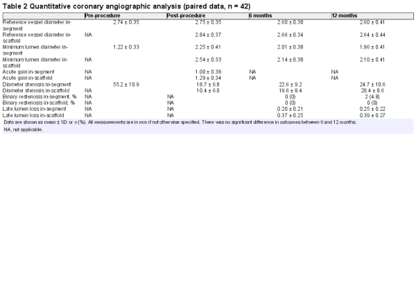 Paired QCA data could be obtained in 42 patients from seven centres at a mean follow-up time of 181 ± 17 days and 367 ± 17 days for 6- and 12-month assessments, respectively. Paired in-segment LLL at 6 and 12 months was 0.20 ± 0.21 mm (95% CI: 0.13;0.26) and 0.25 ± 0.22 mm (95% CI: 0.18;0.32), P = 0.117, Δ 0.05 ± 0.21 mm (95% CI: −0.01;0.12), and in-scaffold LLL 0.37 ± 0.25 mm (95% CI: 0.29;0.45) and 0.39 ± 0.27 mm (95% CI: 0.31;0.48), P = 0.446, Δ 0.03 ± 0.22 mm (95% CI: −0.04;0.10) (Table 2, Figure 2). The in-segment and in-scaffold LLL of the overall population at 6 months were 0.27 ± 0.37 and 0.44 ± 0.36 mm for the overall population (0.21 ± 0.28 and 0.37 ± 0.28 mm in patients without TLR). There was no statistically significant difference in baseline characteristics between this subgroup and the overall patient population.