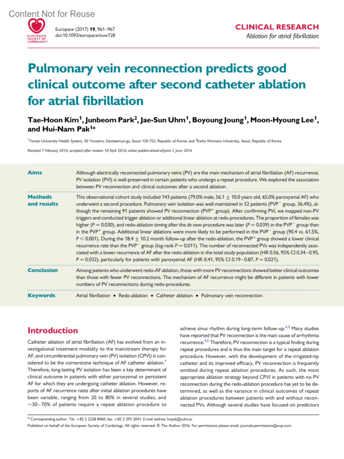 Pulmonary vein reconnection predicts good clinical outcome after second catheter ablation for atrial fibrillation