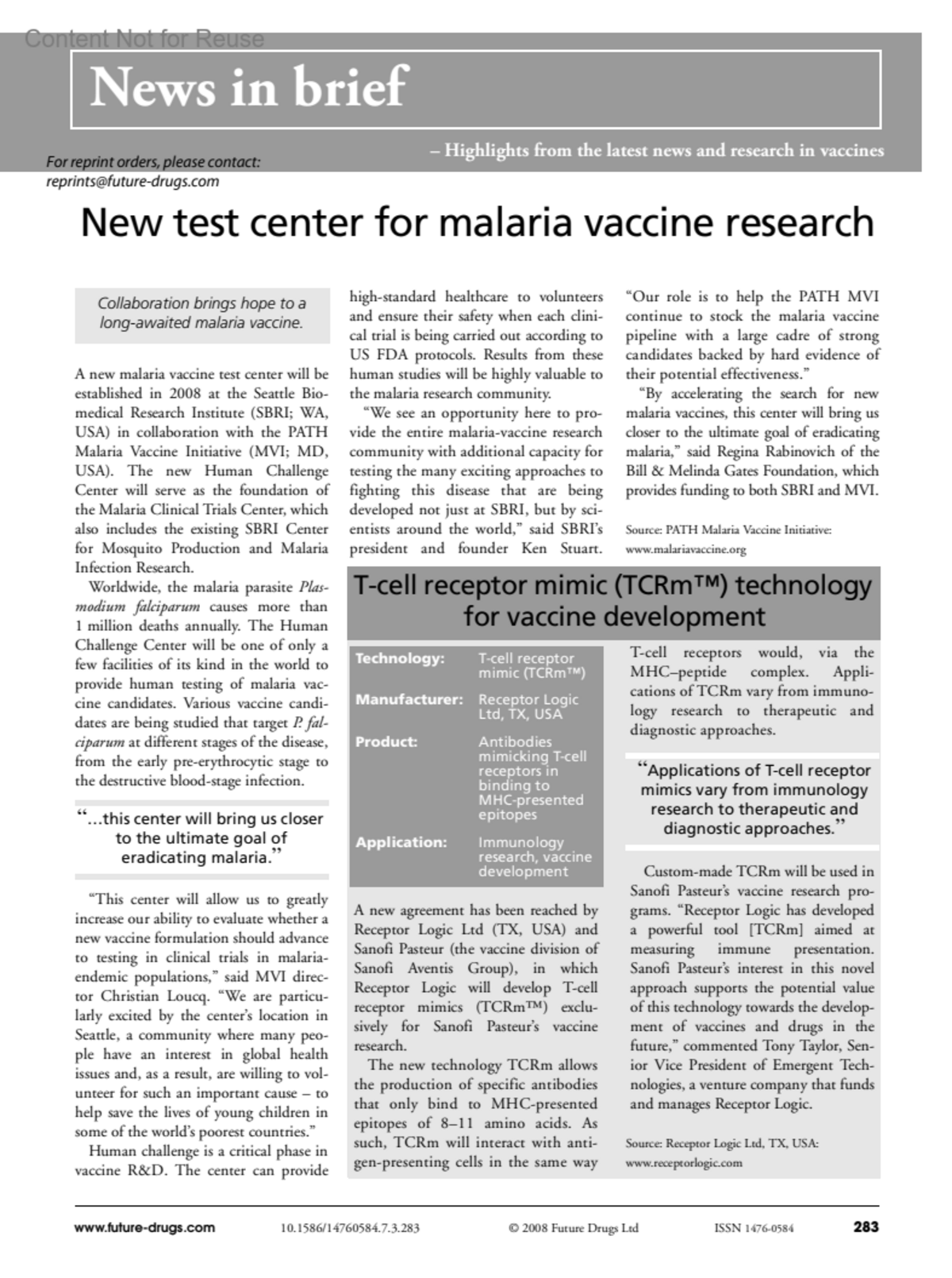 T-cell receptor mimic (TCRm™) technology for vaccine developmentExpert Review of Vaccines 7(3):p 283, April 2008.Copyright © © 2008Expert Reviews, Ltd.
