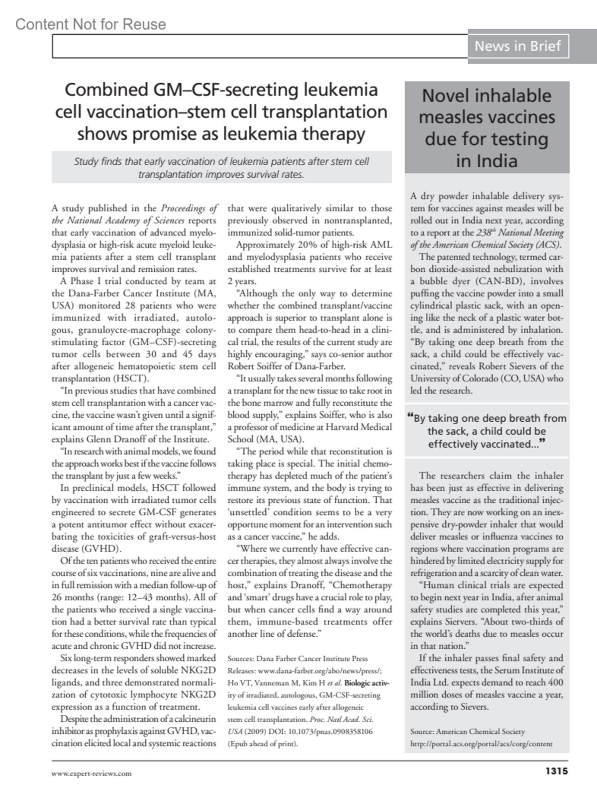 Combined GM–CSF-secreting leukemia cell vaccination–stem cell transplantation shows promise as leukemia therapyExpert Review of Vaccines 8(10):p 1313-1315, October 2009.Copyright © © 2009Expert Reviews, Ltd.