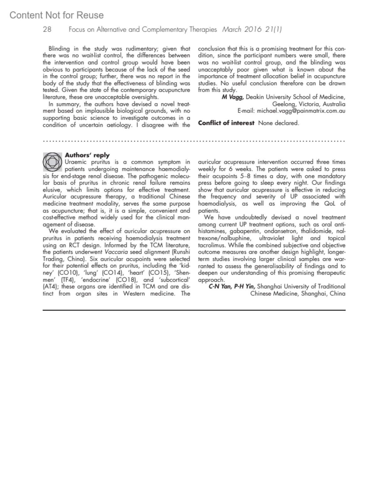Auricular acupressure for uraemic pruritus – a treatment in search of a problemYan, C-NYin, P-HAuthor information1 Shanghai University of Traditional Chinese Medicine, Shanghai, ChinaFocus On Alternative And Complementary Therapies An Evidence-Based Approach 21(1):p 28, March 2016.Copyright © 2016 John Wiley & Sons, Ltd