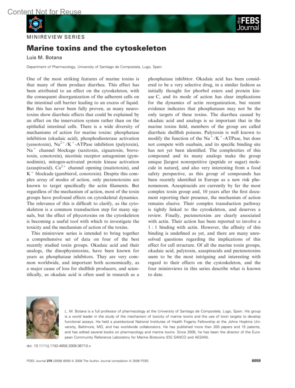 L. M. Botana is a full professor of pharmacology at the University of Santiago de Compostela, Lugo, Spain. His group is a world leader in the study of the mechanism of toxicity of marine toxins and the use of toxin targets to develop functional assays. He held a postdoctoral National Institutes of Health Fogarty Fellowship at the Johns Hopkins University, Baltimore, MD, and has worldwide collaborators. He has published more than 200 papers and 15 patents, and has edited several books on pharmacology and marine toxins. Since 2005, he has been the director of the European Community Reference Laboratory for Marine Biotoxins (DG SANCO and AESAN).