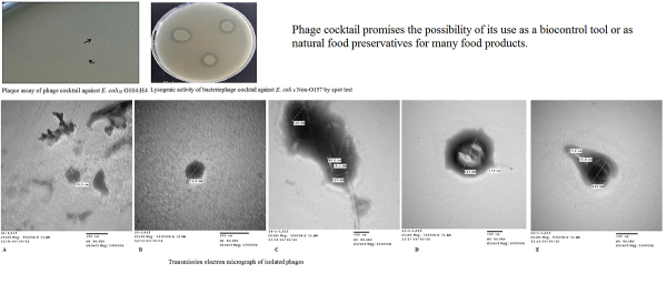 Escherichia coli serotype O157: H7 and E. coli O104: H4 are well known foodborne pathogens causing sever enteric illness. Using bacteriophages as biocontrol agents of some foodborne pathogens and multidrug-resistant (MDR) bacteria has a great attention nowadays. This study aims to test the effect of cocktail phages on the growth of some foodborne pathogens and MDR E. coli. Routine conventional PCR was used to confirm the identification of E. coli isolates. Double-layered culture technique was used to isolate phages from sewage water. Morphology of bacteriophage was described using transmission electron microscopy, and spot test was performed to determine host range of the phage cocktail. Phage cocktail of Siphoviridae and Podoviridae family infecting E. coli O157: H7, E. coli O104: H4 and untypeable E. coli (neither O157 nor O104) has been isolated from sewage water. Phage cocktail showed both lytic and lysogenic activity. Lytic activity was observed against E. coli O157: H7, E. coli O104: H4 isolates, Staphylococcus. aureus ATCC6538 and Pseudomonas aeruginosa ATCC 10145, while the lysogenic activity was observed against the untypeable strain. The tested phage cocktail showed a promising inhibitory action on E. coli O157: H7 and O104: H4, S. aureus ATCC6538 and P. aeruginosa ATCC 10145, suggesting the possibility of its use as a biocontrol tool or as natural food preservatives for many food products.