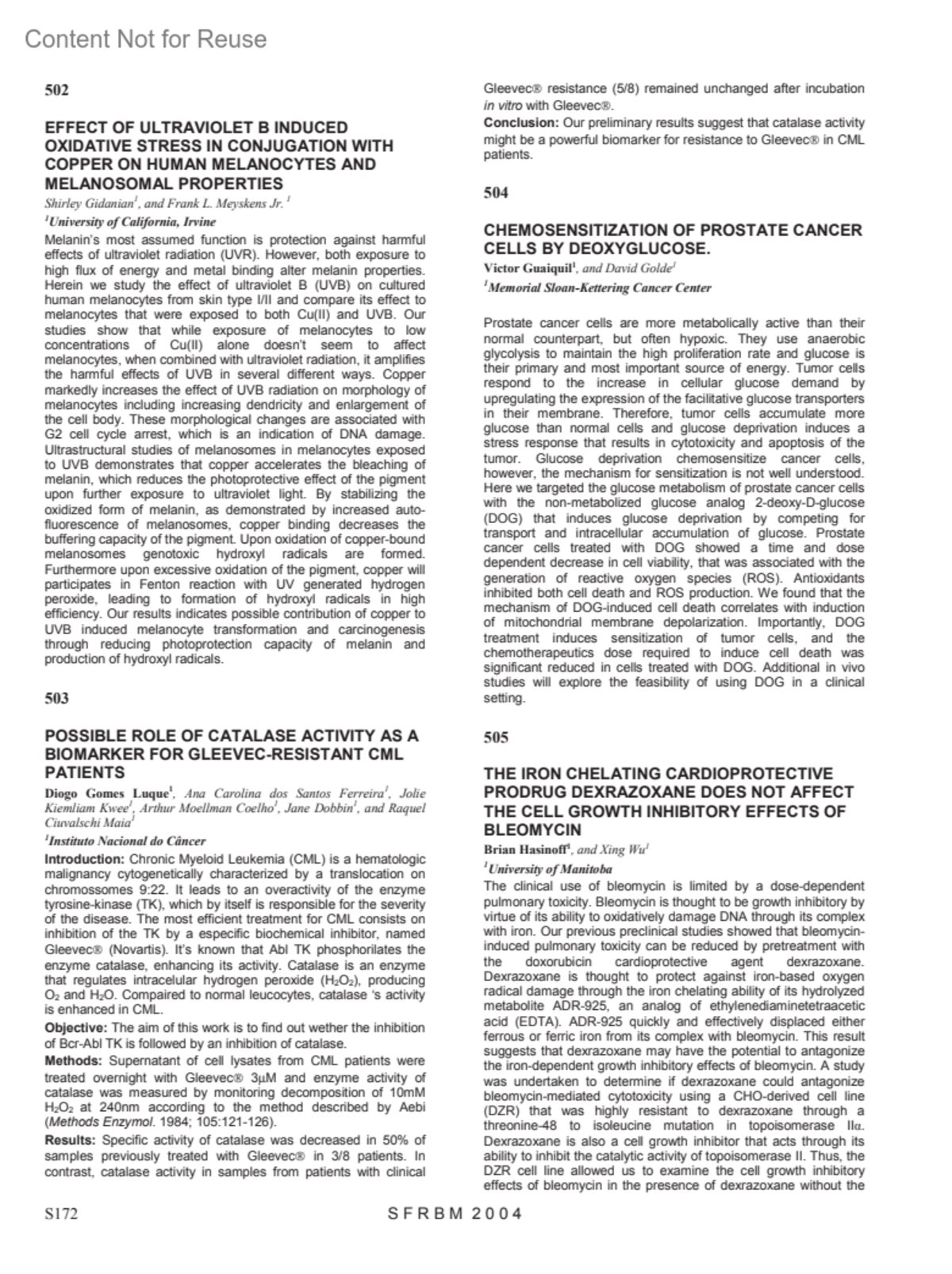 THE IRON CHELATING CARDIOPROTECTIVE PRODRUG DEXRAZOXANE DOES NOT AFFECT THE CELL GROWTH INHIBITORY EFFECTS OF BLEOMYCIN505Hasinoff, BrianWu, XingAuthor information1University of ManitobaFree Radical Biology and Medicine 37:p S172-S173, September 2004.Copyright © 2004Elsevier, Inc.