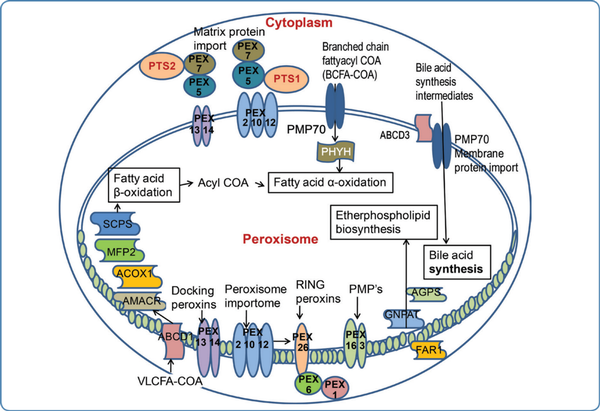Peroxisomes are single membrane cytoplasmic organelles with diverse dynamic functions. The word 'peroxisome' was coined by Christian de Duve. Peroxisomes are involved in multiple metabolic functions in the body (Figurel). They do not have their own DNA like mitochondria. Membrane proteins, matrix proteins, and peroxins are peroxisomal proteins that are responsible for maintaining the structure of peroxisomes, for peroxisomal division/assembly, and for performing various cellular biochemical functions.