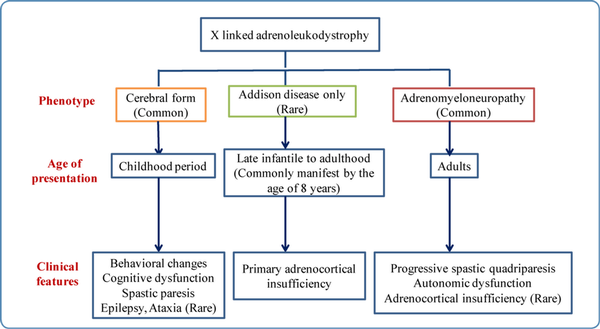 X-linked adrenoleukodystrophy (X-ALD): X-ALD is an X-linked recessive disorder. It does not have any clinical features at birth. It can manifest with three different phenotypes. Different forms of X-ALD, their specific clinical features, and their age of presentation are depicted in Figure 4. Some female carriers can present with adrenomyeloneuropathy.