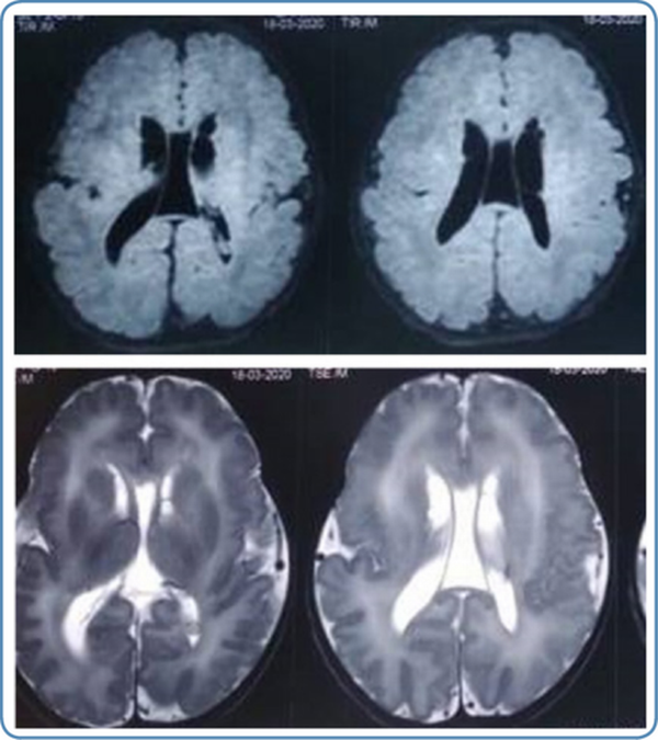 In peroxisomal disorders, specific findings in magnetic resonance imaging (MRI) of the brain are seen only in Zellweger syndrome (Figure 7) and X-ALD. In other peroxisomal disorders, MRI brain findings may provide clues to the diagnosis. MRI brain findings in peroxisomal disorders are listed in Table 4. Typical findings of the MRI brain may not be found in the initial stages of the disease in peroxisomal disorders as they evolve gradually during the disease course. In such a scenario biochemical workup and genetic evaluation would help in the diagnosis.