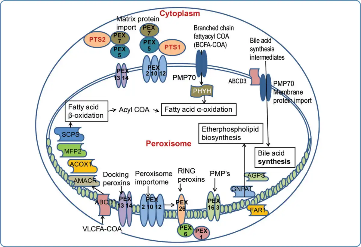 Peroxisomes are single membrane cytoplasmic organelles with diverse dynamic functions. The word 'peroxisome' was coined by Christian de Duve. Peroxisomes are involved in multiple metabolic functions in the body (Figurel). They do not have their own DNA like mitochondria. Membrane proteins, matrix proteins, and peroxins are peroxisomal proteins that are responsible for maintaining the structure of peroxisomes, for peroxisomal division/assembly, and for performing various cellular biochemical functions.