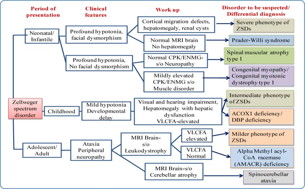 The phenotype of ZSDs usually ranges from severe form to intermediate and milder forms with the typical presentation. Patients with atypical presentation lacking the classical signs and symptoms of ZSDs have also been described. Dysmorphic features in severe ZSDs include the high forehead, large anterior fontanelle, hypoplastic supraorbital ridges, epicanthal folds, corneal clouding, cataract, and broad nasal bridge (Figure 2). Prognosis is guarded with early neonatal or infantile death. Most of the intermediate forms of ZSDs have late childhood deaths. Clues to the diagnosis of Zellweger spectrum disorders in different age groups with the differential diagnosis are depicted in Figure 3. The neonatal phenotype of X-linked adrenoleukodystrophy due to contiguous deletion of the ABCD1 gene which mimics peroxisome biogenesis disorders has also been described.