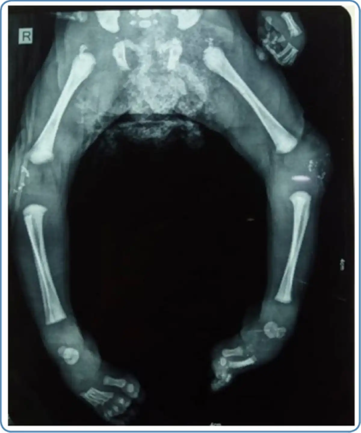 Chondrodysplasia punctata at the knee and/ or ankle joints and along the vertebrae in early childhood and rhizomelic shortening are noted in skeletal radiographs in cases with RCDP and Zellweger syndrome (Figure 6). In addition, vertebral cleftsare seen on the skeletal survey in RCDP.
