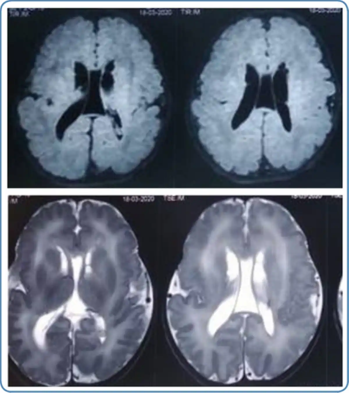 MRI brain findings in Zellweger syndrome 6A.T2 weighted MRI brain axial view showing germinolytic cysts 6B. T1 weighted MRI brain axial view showing diffuse polymicrogyria