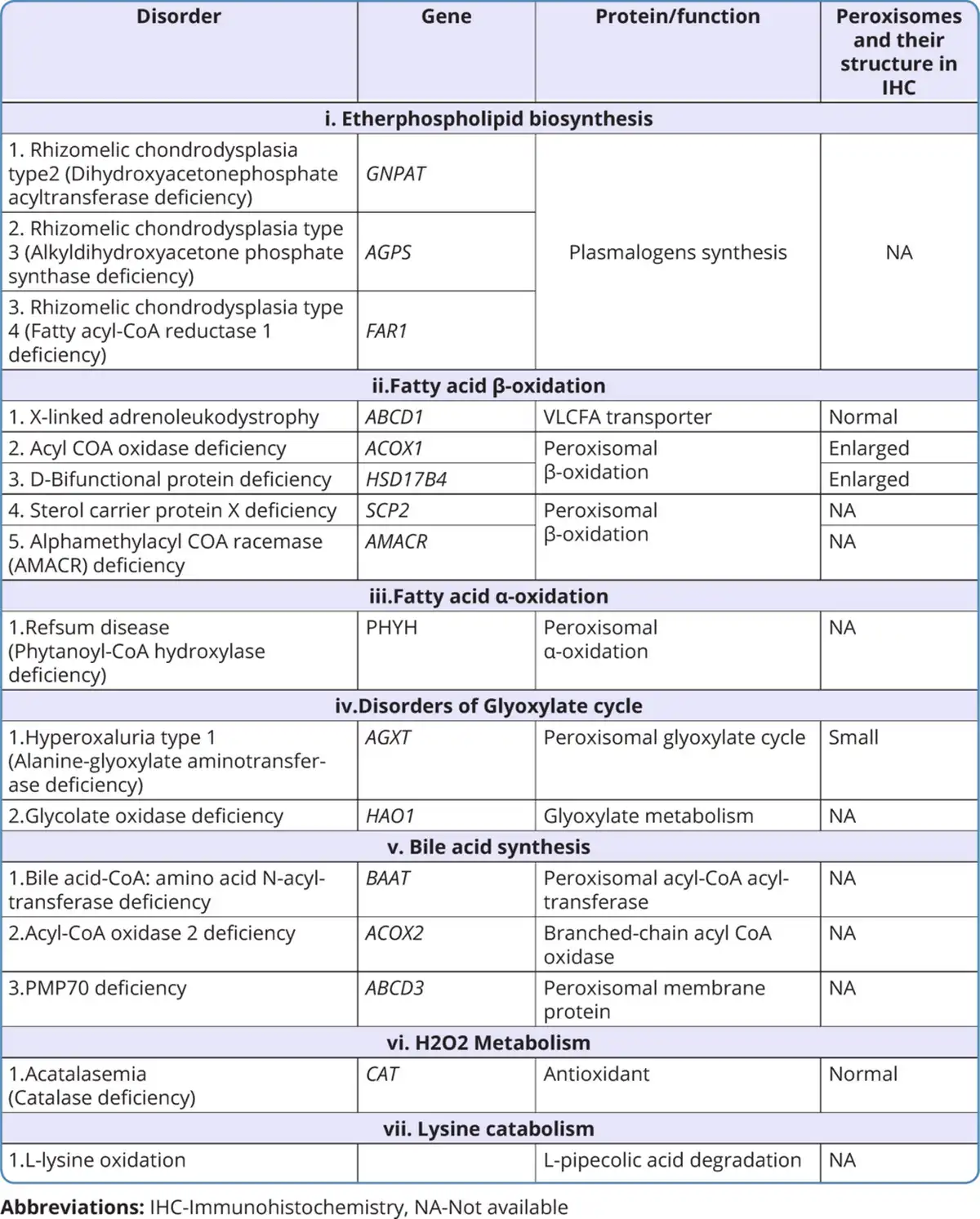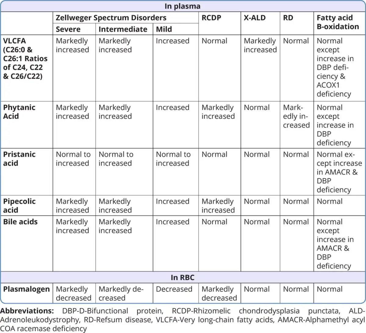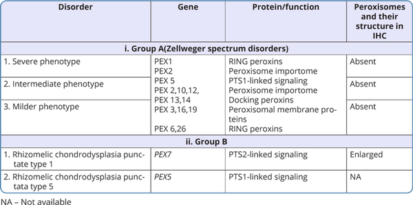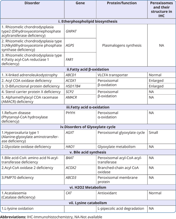 Table 3 shows the list of various biochemical substances measured in blood and their levels in different peroxisomal disorders.