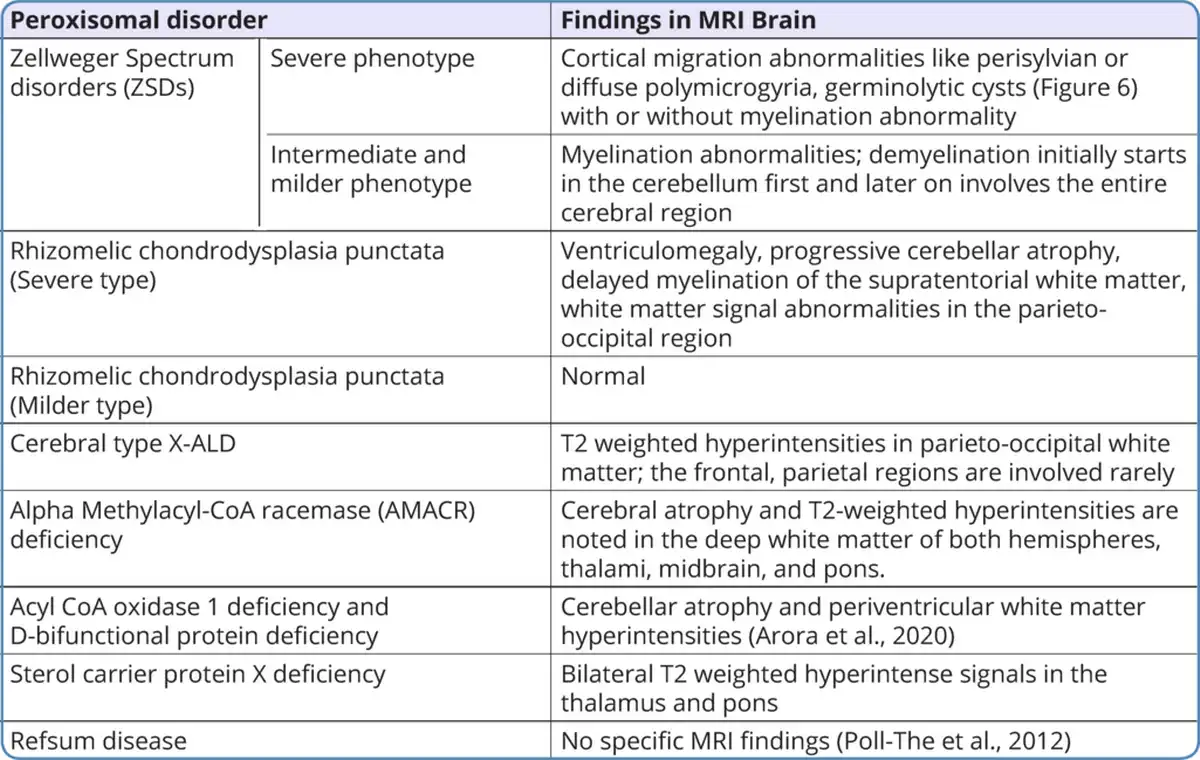 In peroxisomal disorders, specific findings in magnetic resonance imaging (MRI) of the brain are seen only in Zellweger syndrome (Figure 7) and X-ALD. In other peroxisomal disorders, MRI brain findings may provide clues to the diagnosis. MRI brain findings in peroxisomal disorders are listed in Table 4. Typical findings of the MRI brain may not be found in the initial stages of the disease in peroxisomal disorders as they evolve gradually during the disease course. In such a scenario biochemical workup and genetic evaluation would help in the diagnosis.
