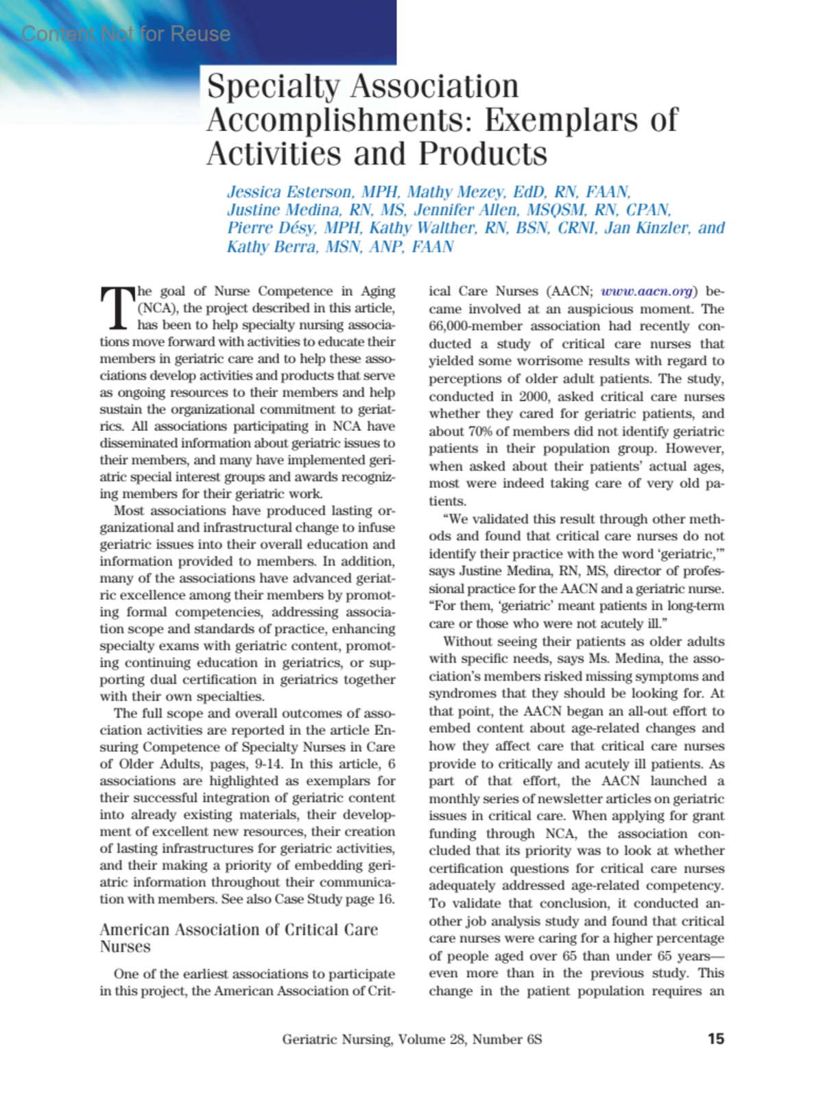 JESSICA ESTERSON, MPH, is a program director at The Hartford Institute for Geriatric Nursing, New York University College of Nursing, New York. MATHY MEZEY, EdD, RN, FAAN, is professor and director at the Hartford Institute for Geriatric Nursing, New York University College of Nursing, New York. JUSTINE MEDINA, RN, MS, is director of professional practice at the American Association of Critical-Care Nurses, Aliso Viejo, California. JENNIFER ALLEN, MSQSM, RN, CPAN, is the Geriatric Specialty Practice Group coordinator at the American Society for PeriAnesthesia Nurses, and Department Head, Post Anesthesia Care Unit, National Naval Medical Center, Bethesda, Maryland. PIERRE DÉSY, MPH, is director of the Injury Prevention Institute/EN CARE, Emergency Nurses Association, Des Plaines, Illinois. KATHY WALTHER, RN, BSN, CRNI, is the education manager at the Infusion Nurses Society, Norwood, Massachusetts. JAN KINZLER, is the corporate relations manager at the Oncology Nurses Society, Pittsburgh, Pennsylvania. KATHY BERRA, MSN, ANP, FAAN, is past president of the Preventive Cardiovascular Nurses Association, and clinical director of the Stanford Heart Network, Palo Alto, California.