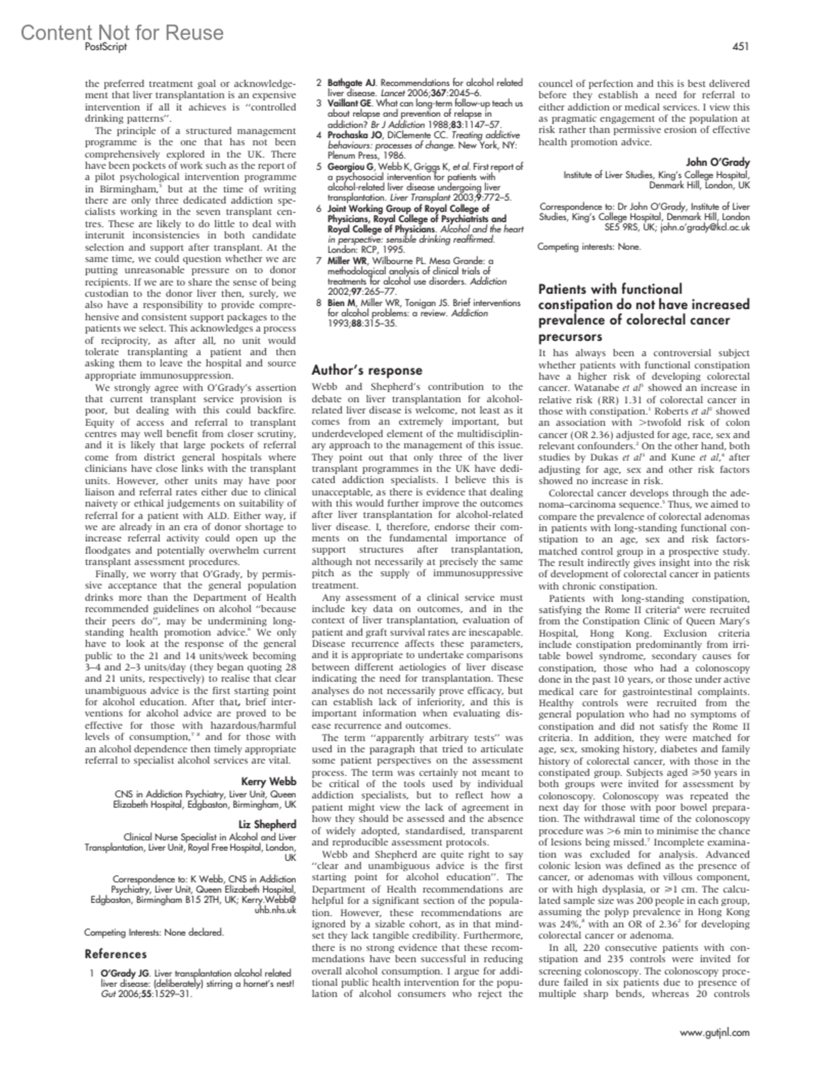 Response from the hornet’s nest: furthering the debate on transplantation for alcoholic liver disease: Author’s responseO’Grady, JohnAuthor informationInstitute of Liver Studies, King’s College Hospital, Denmark Hill, London, UKCorrespondence to: Dr John O’Grady Institute of Liver Studies, King’s College Hospital, Denmark Hill, London SE5 9RS, UK; john.o’[email protected]Competing interests: None declared.Gut 56(3):p 451, March 2007.Copyright © 2007 BMJ Publishing Group Ltd and the British Society of Gastroenterology