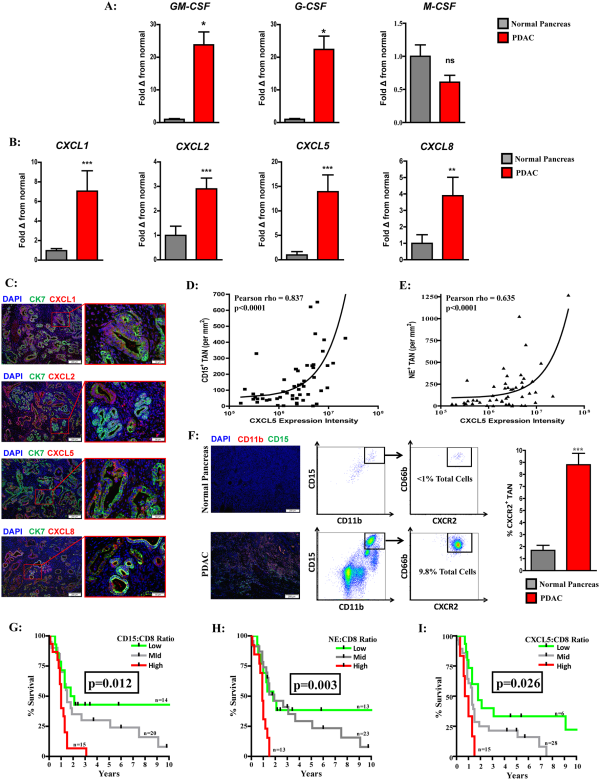 Elevated ELR+ chemokine expression correlates with CXCR2+TAN and worse prognosis in human PDAC. (A) Quantitative real-time PCR analysis of GM-CSF, M-CSF and G-CSF expression from human PDAC tumours (n=11) relative to normal pancreas (n=7). (B) Quantitative real-time PCR analysis of the ELR+ chemokine CXCL1, CXCL2, CXCL5 and CXCL8 expression from human PDAC tumours (n=11) relative to normal pancreas (n=7). (C) Fluorescent microscopy images demonstrating CXCL1, CXCL2, CXCL5 and CXCL8 (red) expression with DAPI nuclear (blue) and cytokeratin 7 (CK7; green) counterstain in human PDAC tumours. (D) Pearson (two tailed) correlation of CXCL5 expression intensity and CD15+ TAN infiltrate in human PDAC tumours (n=54). (E) Pearson correlation (two tailed) of CXCL5 expression intensity and NE+ TAN infiltrate in human PDAC tumours (n=54). (F) Representative immunofluorescence showing CD11b+, CD15+ TAN (yellow) in normal pancreas (top) and PDAC tumours (bottom). Representative flow cytometry plots illustrating CD11b+, CD15+, CD66b+, CXCR2+ TAN in normal pancreas (top) and PDAC tumour (bottom) gated on CD45+ cells. Graph depicts CXCR2+ TAN as percentage of total cells by flow cytometry from normal pancreas (n=7) and human PDAC tumours (n=11). (G) Survival analysis of intratumoural CD15+ to CD8+ ratio from resected human PDAC tumour microarray (n=49). (H) Survival analysis of intratumoural NE+ to CD8+ ratio from resected human PDAC tissue microarray (n=49). (I) Survival analysis of intratumoural CXCL5 to CD8+ ratio from resected human PDAC tissue microarray (n=49). Two-tailed unpaired t-test or Kaplan-Meier survival analysis was used to calculate P values. *P<0.05; **P<0.01; ***P<0.001. G-CSF, granulocyte colony-stimulating factor; GM-CSF, granulocyte-macrophage colony-stimulating factor; M-CSF, macrophage colony-stimulating factor; PDAC, pancreatic adenocarcinoma; TAN, tumour-associated neutrophils.