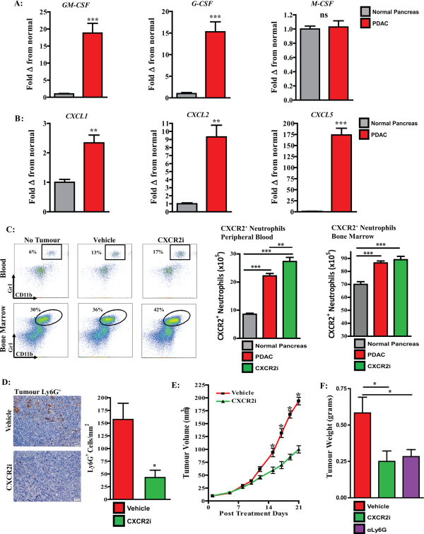 Targeting CXCR2 sequesters neutrophils in the peripheral blood and prevents TAN accumulation in PDAC tumour-bearing animals. (A) Quantitative real-time PCR was performed for expression of GM-CSF, M-CSF and G-CSF on normal murine pancreas (n=5) and orthotopically implanted KCKO PDAC tumours (n=9). (B) Quantitative real-time PCR was performed for expression of ΣCXC+ chemokines on normal murine pancreas (n=5) and orthotopically implanted PDAC tumours (n=9). (C) Representative flow cytometry plots of CXCR2+ neutrophils in the peripheral blood (top) and bone marrow (bottom) from non-tumour controls and tumour-bearing animals receiving treatment with vehicle or CXCR2i. Graphs depict absolute number of CXCR2+ neutrophils (×105) per 100 µL of blood (n=9–12 per group) and bone marrow from the femur (n=4 per group) of non-tumour-bearing controls and KCKO tumour-bearing animals receiving treatment with vehicle or CXCR2i (D) Representative IHC and analysis of Ly6G+ TAN from orthotopic PDAC tumours of animals treated with vehicle or CXCR2i (n=6–9 per group). (E) Tumour growth curve of subcutaneously implanted KCKO tumours from mice treated with vehicle or CXCR2i. Treatment initiated following randomisation of palpable tumours on postimplantation day 10. (F) Tumour weights from established orthotopic KPC tumours treated with CXCR2i or Ly6G specific depleting antibody for 20 days (n=6 per group). Data reflect analysis from at least two repeated experiments. Two-tailed unpaired t-test or ANOVA was used to calculate P values. *P<0.05; **P<0.01; ***P<0.001. ANOVA, analysis of variance; PDAC, pancreatic adenocarcinoma; TAN, tumour-associated neutrophils.