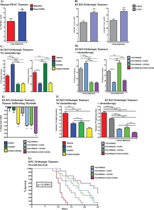Human and murine PDAC tumours demonstrate myeloid substitution following bone marrow cell targeted therapies, which is overcome by combined CCR2 plus CXCR2 blockade. (A) Comparison total PDAC-infiltrating CXCR2+ TAN was assessed by flow cytometry from matched FNA tumour biopsies at baseline following treatment with an orally dosed, small molecule CCR2i (blue) in combination with FOLFIRINOX (n=6 matched specimens). (B) Absolute number of CXCR2+ TAN per gram of tissue (×105) was assessed by flow cytometry from CCR2−/− and wild-type mice treated with vehicle alone (left) or in combination with FOLFIRINOX (right) 25 days following orthotopic KCKO tumour implantation (n=5–6 mice/group). (C) Absolute number of CXCR2+ TAN (Left) and CCR2+ TAM (Right) per gram of tumour (×105) was assessed by flow cytometry following 25 days of treatment with chemokine blockade alone (n=12 mice/group). (D) Absolute number of CXCR2+ TAN (Right) and CCR2+ TAM (Left) per gram of tumour (×105) was assessed by flow cytometry following 25 days of treatment with chemokine blockade in combination with FOLFIRINOX chemotherapy (n=9 mice/group). (E) Total tumour-infiltrating myeloids was assessed by flow cytometry and represented as percentage change from vehicle treated controls following chemokine receptor blockade alone and in combination with FOLFIRINOX (n=9–12 mice/group). (F) Orthotopic KCKO tumour weights following 25 days of treatment with chemokine receptor blockade alone (left; n=12 mice/group) and in combination with FOLFIRINOX chemotherapy (right; n=9 mice/group). (G) Survival analysis of KPC orthotopic tumour-bearing mice treated with FOLFIRINOX alone and in combination with PF-04136309 (CCR2i) or CXCR2i (n=10–15 mice per group). One-way ANOVA and two-tailed paired, for matched samples, or unpaired t-test were used to calculate P values. For survival analysis, P values were obtained by the log-rank (Mantel-Cox) test. *P<0.05; **P<0.01; ***P<0.001. ANOVA, analysis of variance; PDAC, pancreatic adenocarcinoma; TAM, tumour-associated macrophages; TAN, tumour-associated neutrophils.
