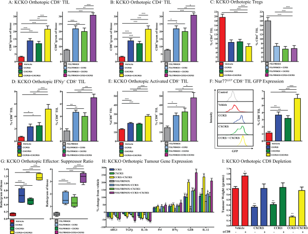 Depleting PDAC-infiltrating CCR2+ macrophages and CXCR2+ neutrophils in combination improves antitumour T cell responses. (A) Absolute number of CD8+ TIL per gram of tumour (×105) was assessed by flow cytometry from orthotopically implanted KCKO tumours following 25 days of treatment with chemokine blockade alone (left; n=12 mice/group) and in combination with FOLFIRINOX chemotherapy (right; n=9 mice/group). (B) Absolute number of CD4+ TIL per gram of tumour (×105) was assessed by flow cytometry from orthotopically implanted KCKO tumours following 25 days of treatment with chemokine blockade alone (left; n=12 mice/group) and in combination with FOLFIRINOX chemotherapy (right; n=9 mice/group). (C) Regulatory T cells (FoxP3+ and CD25+) expressed as percentage of total CD4+ TIL was assessed by flow cytometry from orthotopically implanted KCKO tumours following 25 days of treatment with chemokine blockade alone (left; n=9–12 mice/group) and in combination with FOLFIRINOX chemotherapy (right; n=6 mice/group). (D) Intracellular IFNγ-positive CD8+ TIL expressed as percentage of total CD8+ T cells was assessed by flow cytometry from orthotopically implanted KCKO tumours following 25 days of treatment with chemokine blockade alone (left; n=6 mice/group) and in combination with FOLFIRINOX chemotherapy (right; n=6 mice/group). (E) CD69+, CD44+, CD62L−and activated CD8+ TIL expressed as percentage of total CD8+ TIL were assessed by flow cytometry from orthotopically implanted KCKO tumours following 25 days of treatment with chemokine blockade alone (left; n=9 mice/group) and in combination with FOLFIRINOX chemotherapy (right; n=6 mice/group). (F) GFP expressing CD8+ TIL assessed by flow cytometry from Nur77GFP T cell report mice with KCKO tumours 21 days following treatment with chemokine receptor inhibitor (n=4–6 mice/group). (G) Intratumoural effector to suppressor cell ratio per gram of tumour from orthotopically implanted KCKO tumours following 25 days of treatment with chemokine blockade alone (left; n=9–12 mice/group) and in combination with FOLFIRINOX chemotherapy (right; n=9 mice/group). (H) Orthotopic KCKO tumour gene expression following 25 days of treatment with chemokine blockade alone (left; n=5 mice/group) and in combination with FOLFIRINOX chemotherapy (right; n=5 mice/group). (I) Orthotopic KCKO tumour weights following chemokine receptor inhibitor with CD8 depleting antibody or IgG control (n=5–6 mice/group). One-way ANOVA was used to calculate P values. *P<0.05; **P<0.01; ***P<0.001. ANOVA, analysis of variance; PDAC, pancreatic adenocarcinoma; TIL, tumour- infiltrating lymphocytes.