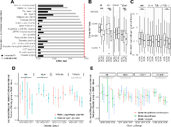 Functional features associated with the severity of obesity in metabolic health groups: effect of bacterial cell load. (A) Major variables explaining the microbiome compositional variation in the MetaCardis cohort subset (distance-based redundancy analyses, dbRDA; genus-level Bray-Curtis dissimilarity), either independently (univariate effect sizes in black) or in a multivariate model (cumulative effect sizes in grey). The cut-off for significant non redundant contribution to the multivariate model is represented by the red line. (B) Gene richness distribution across obesity groups stratified by metabolic health status. (**P value<0.05 in Kruskal- Wallis test controlled for country of recruitment and age, FDR<0.05 pairwise Wilcoxon rank-sum tests controlled for country of recruitment and age). The dash line represents the threshold that stratifies individuals as High vs. Low gene count (HGC/LGC) based on the median of gene richness in healthy German population (n=91) which exhibit gene richness bimodality. (C) Microbial cell counts distribution across obesity groups stratified by metabolic health status. (**P value<0.05 in Kruskal-Wallis test controlled for country of recruitment, FDR<0.05 pairwise Wilcoxon rank-sum tests controlled for country of recruitment). (D) Estimated marginal means and confidence intervals of log-transformed absolute abundances of microbiome biotin biosynthesis and consumption potential across obesity groups adjusted by statin intake and stratified by the metabolic health status. (E) Estimated marginal means and confidence intervals of log-transformed absolute abundances of biotin producers (eg, prokaryotic organisms harboring all biotin biosynthesis genes from pimelate precursor and no biotin biosynthesis transport genes), biotin transporters (prokaryotic organisms with no biotin biosynthesis genes) and biotin producers and transporters (prokaryotic organisms with all biotin biosynthesis genes from pimelate and biotin transport genes) across obesity groups adjusted by statin intake and stratified by the metabolic health status (*FDR<0.05 on linear regression models of feature abundance by obesity status adjusted by statin intake, P-adj<0.05 on pairwise Tukey tests between obesity states). BMI, body mass index; HbA1c, haemoglobin A1c; HDL, high-density lipoprotein; MH, metabolically healthy; MUH, metabolically unhealthy; T2D, type 2 diabetes.
