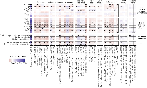 Association between microbiome biotin status and host metabolic and inflammation markers in the MetaCardis subcohort. Heatmap indicating adjusted associations between log-10 transformed QMP abundance profiles of metagenomic signatures regarding biotin production and transport with clinical and lifestyle factors. The y-axis represents independent variables and the variables in the x-axis are the dependent variable (n=1545 individuals). These models were adjusted for the country of recruitment and age. (*P value<0.05; **FDR<0.05. Clinical and lifestyle variables for which no association with FDR<0.05 was found are not included in the heatmap). The color tones correspond to effect sizes represented by standardized beta coefficients from the adjusted linear regression models. Biosynthesis and transport genome groups were defined according to the nomenclature defined in Rodionov et al. Briefly, these included 3 groups of strict biotin producers (P1, P2, P* groups) harboring all 4 genes common to the different pathway variants of biotin biosynthesis from pimelate (P2) or pimeloyl-ACP (P1, P*). This also included 8 groups of strict biotin auxotrophs A&S/A groups; microorganisms not capable of biotin production 45 and with (A&S groups) or without (A groups) genes involved in biotin transport) with different levels of incompletion in the 4 core biotin biosynthesis genes (harboring from 1 to 3 biosynthetic genes at most), and 4 groups of biotin producers that also harbors genes coding for biotin transport (P&S groups). ALT, alanine aminotransferase; AST, aspartate aminotransferase; BMI, body mass index; CXCL5, C-X-C motif chemokine ligand 5; GGT, γ-glutamyltransferase; HDL, high-density lipoprotein. LDL, low-density lipoprotein.