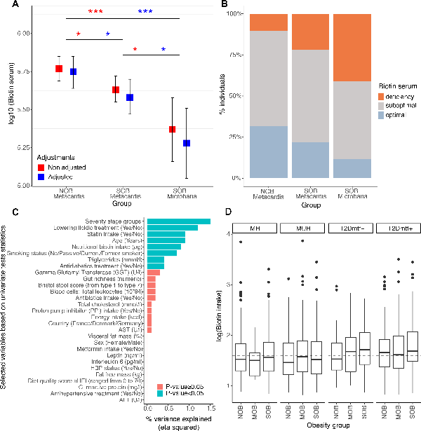 Systemic and nutritional biotin profiles across obesity groups in MetaCardis subcohort. (A) Differences of biotin serum levels between obesity groups in 212 individuals from the MetaCardis subcohort (n=107 (NOB), n=105 (SOB)) and 17 more severely obese individuals of the Microbaria study (*P value<0.05; ***P value<0.001). Significant differences were observed with non-adjusted and adjusted (for diabetes status, metformin, statin and biotin intakes) Generalized Linear Models and lsmeans function, with P-value adjustment for multiple comparisons with Benjamini-Hochberg method. Biotin serum was log10 transformed to enable a normal distribution of the biotin variable (NOB vs. SOB (MetaCardis and Microbaria) Cohen’s D effect size=0.91. NOB vs. SOB MetaCardis Cohen’s effect size D =0.18). (B) Distribution of biotin deficiency status between obesity groups according to the following thresholds: deficiency (<200 ng/l), suboptimal levels (200-400 ng/l), optimal levels (>400 ng/l). Significant differences were observed with Chi-2 tests (P-value=1.0x10-2). (C) Association between clinical covariates and biotin status defined by the urinary metabolite 3-hydroxyisovaleric acid. Horizontal bars correspond to the variance in 3-hydroxyisovaleric acid explained by each clinical covariate (measured by the eta squared statistic derived from a multivariate ANCOVA model, n=1545). Statistical significance is indicated for a global model containing all the variables. ALT: Alanine Aminotransferase, AST: Aspartate Aminotransferase, GGT: Gamma-Glutyl Transferase, HBP: high-blood pressure. (D) Differences in log10 transformed nutritional biotin intake (μg/day) across obesity groups stratified by metabolic health status (n=284 (NOB-MH), n=130 (NOB MUH), n=51 (NOB-T2Dmtf-), n=173 (NOB-T2Dmtf+), n=13 (MOB-MH), n=81 (MOB-MUH), n=41 (MOB-T2Dmtf-), n=164 (MOB-T2Dmtf+), n=161 (SOB-MH), n=219 (SOB-MUH), n=85 (SOB T2Dmtf-), n=143 (SOB-T2Dmtf+)). No significant differences in biotin intake were observed across study groups (FDR>0.05; non-parametric pairwise univariate tests controlled by country or statin intake). Dashed line represents the recommended daily biotin intake according to the European Food Safety Authority (40μg/day). ; MH, metabolically healthy; MUH, metabolically unhealthy; T2D, type 2 diabetes.