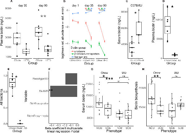 Moreover, convergent experimental results in mice fed a HFD, emphasised the importance of diet quality in explaining altered biotin metabolism. Obesogenic diets led to a decrease in systemic biotin in mice, together with altered microbial biotin metabolism potential. In human populations, the degree to which biotin of bacterial origin contributes to circulating biotin levels remains unmeasured.