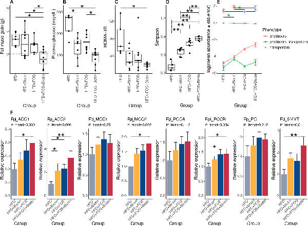 . Effects of biotin and FOS supplementation on host metabolism, biotin status and microbiome composition in established obesity in mouse experiments. (A) Fat mass gain of mice with established obesity, between day 82 (after twelve weeks of HFD and before treatments) and day 135 (after eight weeks of treatment by FOS and/or biotin) (A: HFD+FOS (n=10) vs. HFD (n=5); B: HFD+FOS vs. HFD+Biotin (n=9); C: HFD+Biotin vs. HFD; D: HFD+FOS+Biotin (n=5) vs. HFD; *P value<0.05, Kruskal-Wallis rank test with Dunn’s multiple comparison test) (B) Fasting glycaemia of these same animals measured after 6 weeks of treatment by FOS and/or biotin (*P value<0.05, Kruskal Wallis rank test with Dunn’s multiple comparison test). (C) HOMA-IR index calculated after 6 weeks of treatment by FOS and/or biotin (*P value<0.05, Kruskal Wallis rank test with Dunn’s multiple comparison test). (D) Simpson diversity distribution in different groups of mice with long-term established obesity (**P value<0.01 and FDR<0.05; pairwise Wilcoxon rank-sum test). (E) Mean abundances of biotin producers (bacteria with all biotin biosynthesis genes from pimelate and no biotin transport gene), biotin transporters (bacteria with no gene involved in biotin biosynthesis) and biotin producers+transporters (bacteria harbouring biotin biosynthesis and transport genes) in different groups of mice with long-term established obesity (*P value and FDR<0.05 pairwise Wilcoxon rank-sum test). (F) mRNA expression of biotin carboxylases (ACCA, ACCB, MCC1, MCC2, PCCA, PCCB, PC) and biotin transporter SMVT in epididymal adipose tissue of mice with long term established obesity supplemented with FOS and/or biotin after 20 weeks of total follow-up (Kruskal-Wallis rank test, with Dunn’s multiple comparison; *P value and FDR<0.05, **P value and FDR<0.01, pairwise comparisons and P-trend were calculated using linear contrast tests). HFD, high-fat diet; SMVT, sodium multi vitamin transporter.
