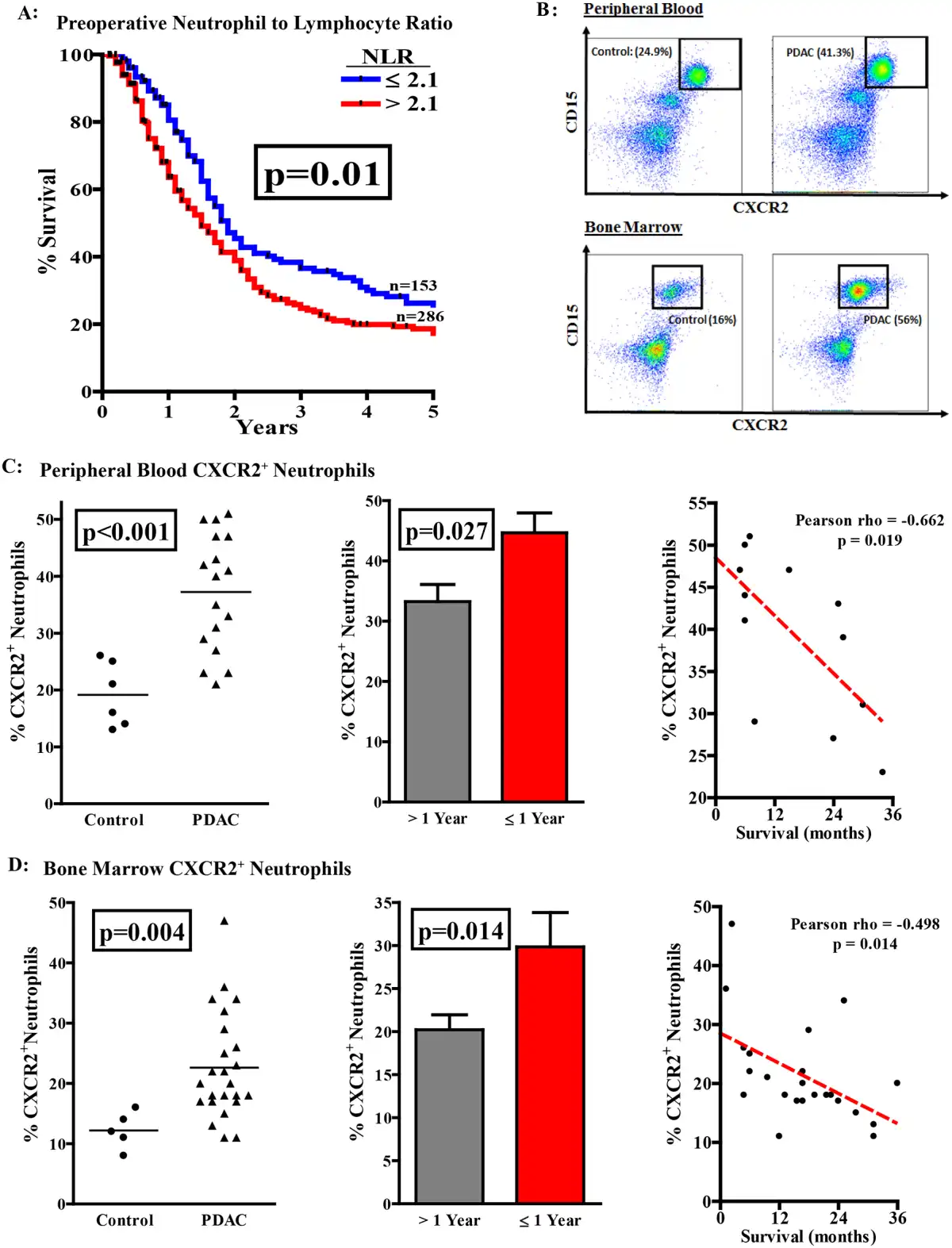Neutrophils expressing CXCR2 are elevated in the blood and bone marrow of patients with human PDAC
