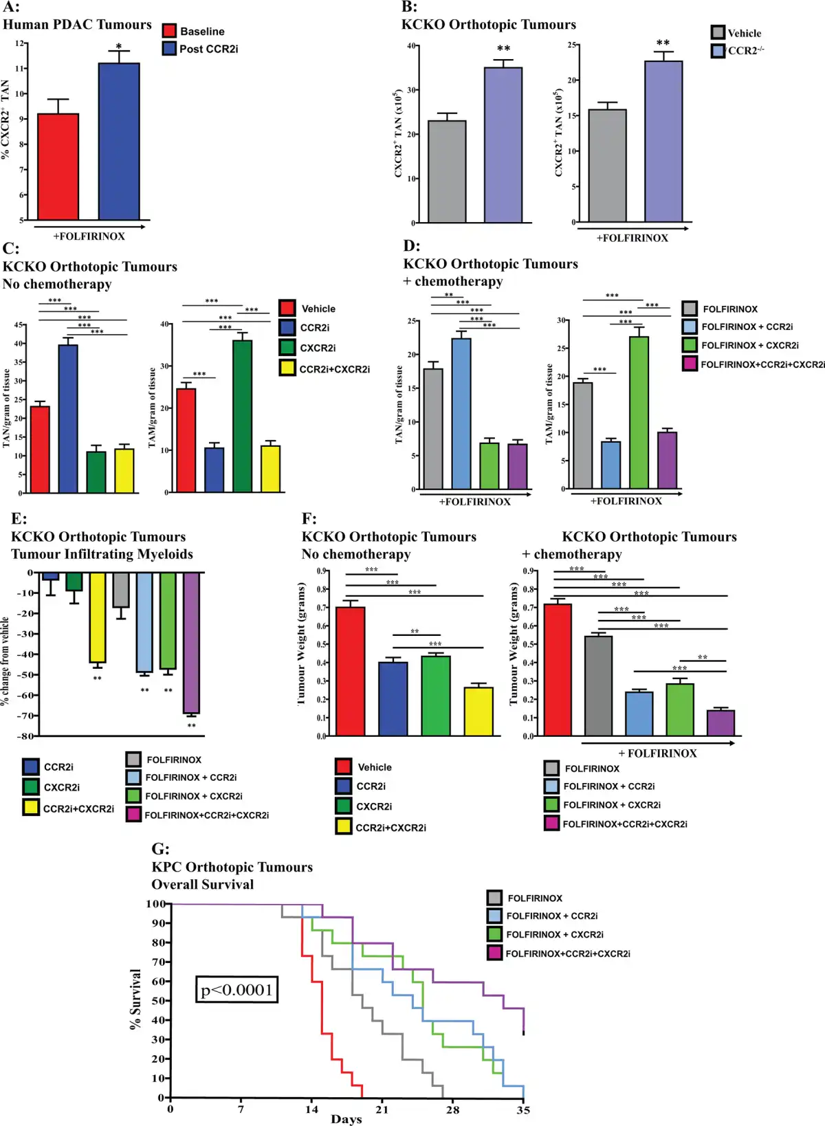 Treatment with a small molecule CCR2 inhibitor, in combination with FOLFIRINOX, prevented TAM accumulation and demonstrated a promising treatment response rate in PDAC compared with chemotherapy alone.