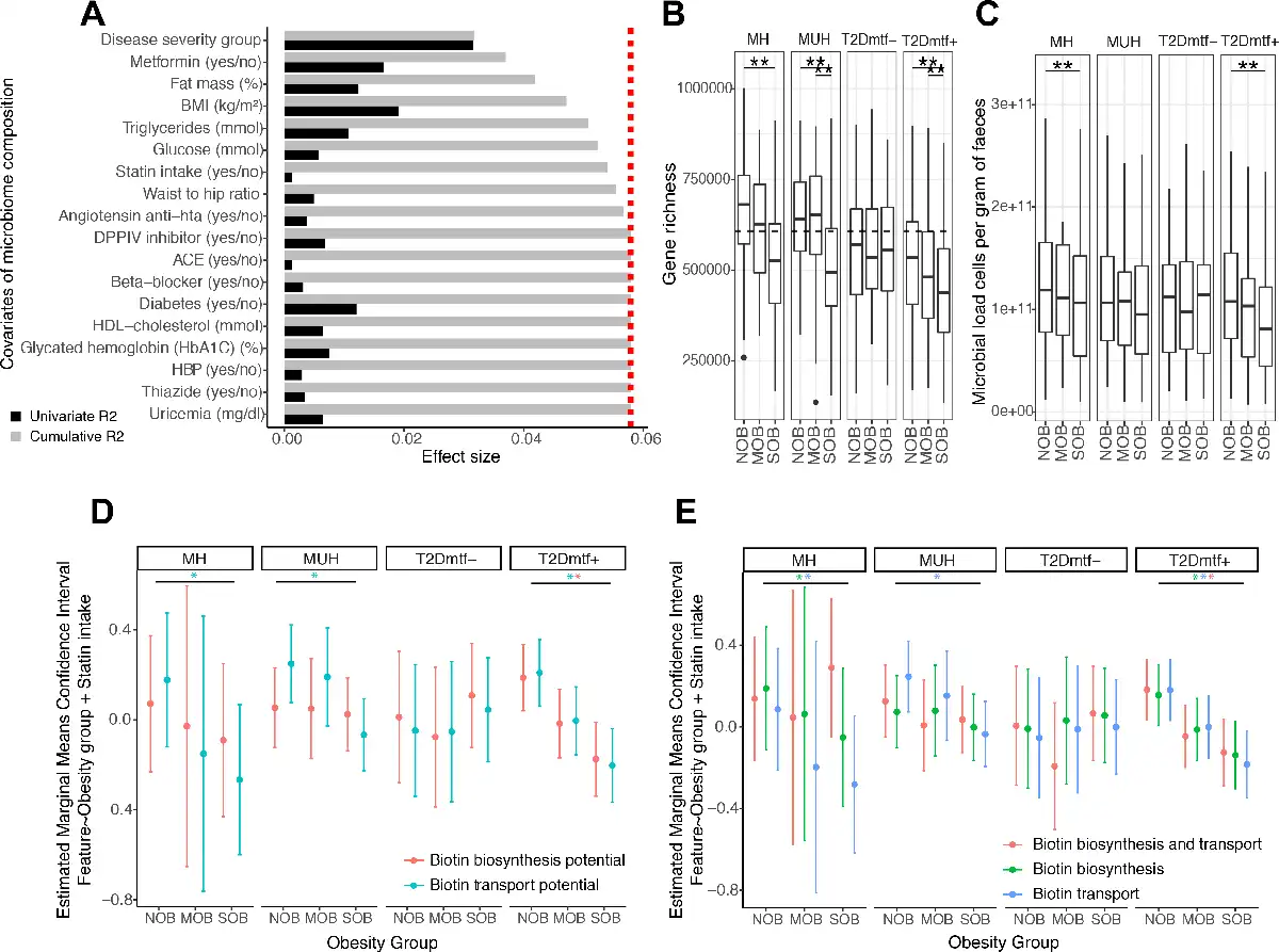 Functional features associated with the severity of obesity in metabolic health groups: effect of bacterial cell load. (A) Major variables explaining the microbiome compositional variation in the MetaCardis cohort subset (distance-based redundancy analyses, dbRDA; genus-level Bray-Curtis dissimilarity), either independently (univariate effect sizes in black) or in a multivariate model (cumulative effect sizes in grey). The cut-off for significant non redundant contribution to the multivariate model is represented by the red line. (B) Gene richness distribution across obesity groups stratified by metabolic health status. (**P value<0.05 in Kruskal- Wallis test controlled for country of recruitment and age, FDR<0.05 pairwise Wilcoxon rank-sum tests controlled for country of recruitment and age). The dash line represents the threshold that stratifies individuals as High vs. Low gene count (HGC/LGC) based on the median of gene richness in healthy German population (n=91) which exhibit gene richness bimodality. (C) Microbial cell counts distribution across obesity groups stratified by metabolic health status. (**P value<0.05 in Kruskal-Wallis test controlled for country of recruitment, FDR<0.05 pairwise Wilcoxon rank-sum tests controlled for country of recruitment). (D) Estimated marginal means and confidence intervals of log-transformed absolute abundances of microbiome biotin biosynthesis and consumption potential across obesity groups adjusted by statin intake and stratified by the metabolic health status. (E) Estimated marginal means and confidence intervals of log-transformed absolute abundances of biotin producers (eg, prokaryotic organisms harboring all biotin biosynthesis genes from pimelate precursor and no biotin biosynthesis transport genes), biotin transporters (prokaryotic organisms with no biotin biosynthesis genes) and biotin producers and transporters (prokaryotic organisms with all biotin biosynthesis genes from pimelate and biotin transport genes) across obesity groups adjusted by statin intake and stratified by the metabolic health status (*FDR<0.05 on linear regression models of feature abundance by obesity status adjusted by statin intake, P-adj<0.05 on pairwise Tukey tests between obesity states). BMI, body mass index; HbA1c, haemoglobin A1c; HDL, high-density lipoprotein; MH, metabolically healthy; MUH, metabolically unhealthy; T2D, type 2 diabetes.