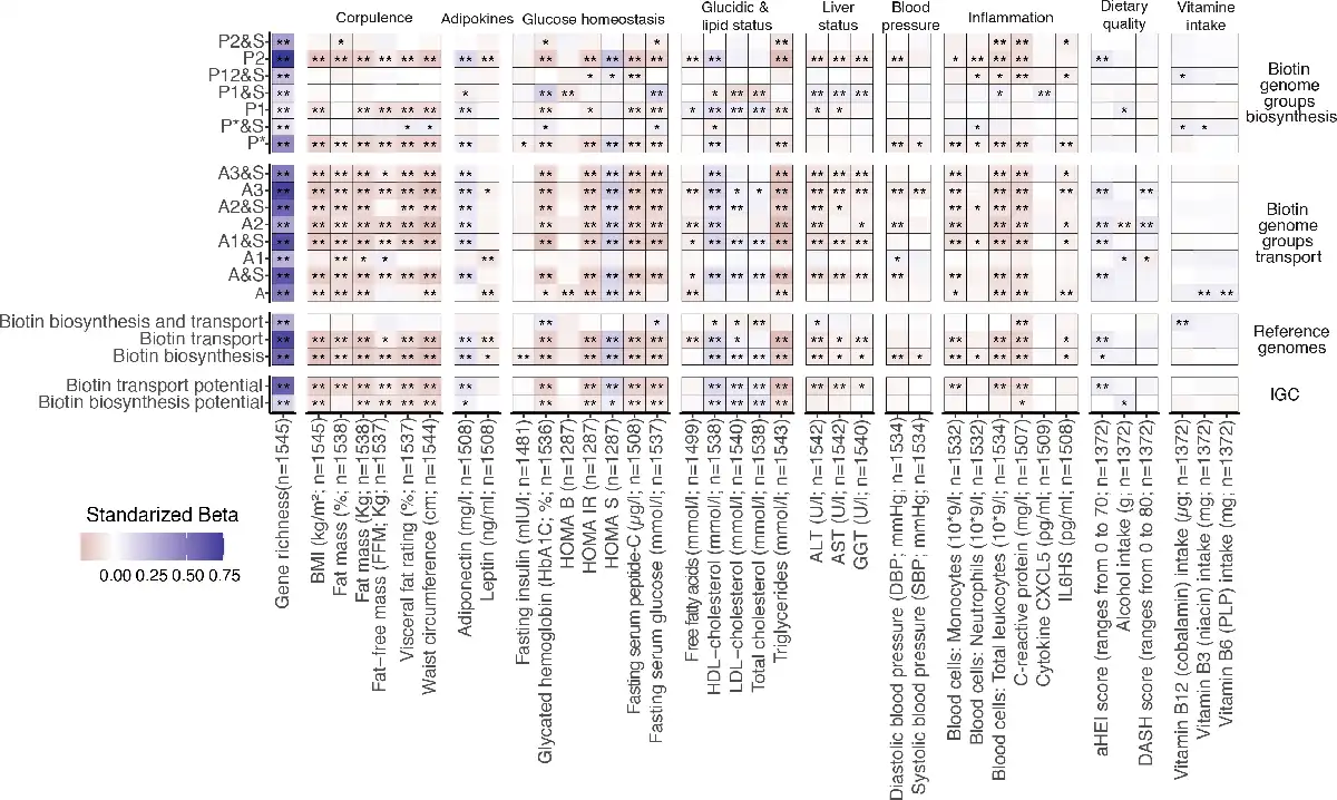 Association between microbiome biotin status and host metabolic and inflammation markers in the MetaCardis subcohort. Heatmap indicating adjusted associations between log-10 transformed QMP abundance profiles of metagenomic signatures regarding biotin production and transport with clinical and lifestyle factors. The y-axis represents independent variables and the variables in the x-axis are the dependent variable (n=1545 individuals). These models were adjusted for the country of recruitment and age. (*P value<0.05; **FDR<0.05. Clinical and lifestyle variables for which no association with FDR<0.05 was found are not included in the heatmap). The color tones correspond to effect sizes represented by standardized beta coefficients from the adjusted linear regression models. Biosynthesis and transport genome groups were defined according to the nomenclature defined in Rodionov et al. Briefly, these included 3 groups of strict biotin producers (P1, P2, P* groups) harboring all 4 genes common to the different pathway variants of biotin biosynthesis from pimelate (P2) or pimeloyl-ACP (P1, P*). This also included 8 groups of strict biotin auxotrophs A&S/A groups; microorganisms not capable of biotin production 45 and with (A&S groups) or without (A groups) genes involved in biotin transport) with different levels of incompletion in the 4 core biotin biosynthesis genes (harboring from 1 to 3 biosynthetic genes at most), and 4 groups of biotin producers that also harbors genes coding for biotin transport (P&S groups). ALT, alanine aminotransferase; AST, aspartate aminotransferase; BMI, body mass index; CXCL5, C-X-C motif chemokine ligand 5; GGT, γ-glutamyltransferase; HDL, high-density lipoprotein. LDL, low-density lipoprotein.