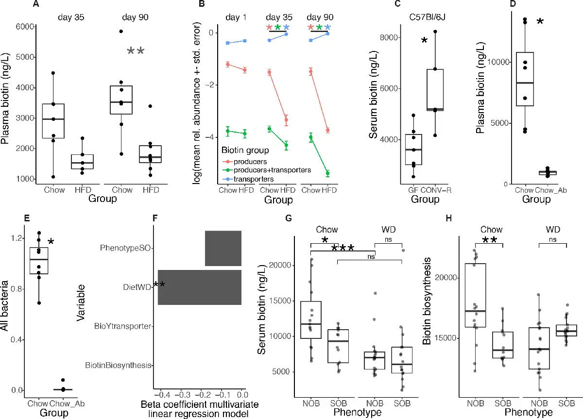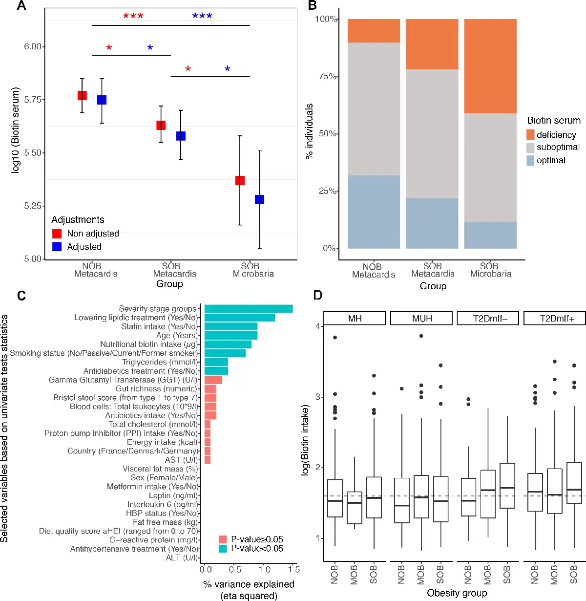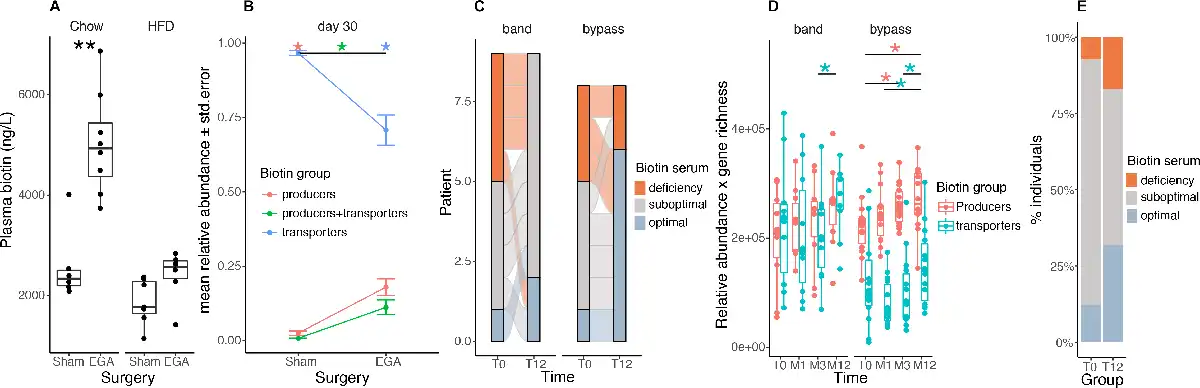 Taking into account dysbiosis and loss of microbial cells, we thus aim to characterise bacterial biotin metabolism potential in severe obesity and investigate its importance for host metabolic state, by cross-sectionally analysing the faecal microbiota of 1545 subjects with obesity at different stages of metabolic deterioration. We further gained deeper insights into bacterial biotin and host cross-talks by performing a series of murine experiments, including the effect of correcting biotin status while acting on gut microbiota dysbiosis.