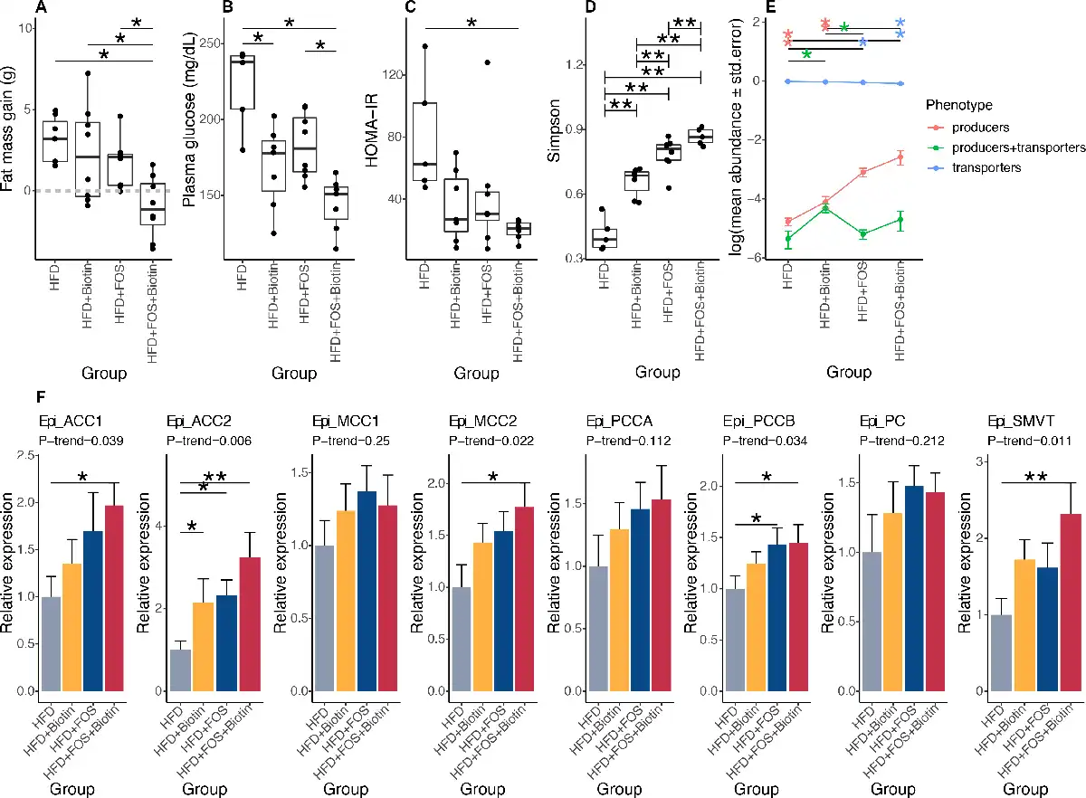 . Effects of biotin and FOS supplementation on host metabolism, biotin status and microbiome composition in established obesity in mouse experiments. (A) Fat mass gain of mice with established obesity, between day 82 (after twelve weeks of HFD and before treatments) and day 135 (after eight weeks of treatment by FOS and/or biotin) (A: HFD+FOS (n=10) vs. HFD (n=5); B: HFD+FOS vs. HFD+Biotin (n=9); C: HFD+Biotin vs. HFD; D: HFD+FOS+Biotin (n=5) vs. HFD; *P value<0.05, Kruskal-Wallis rank test with Dunn’s multiple comparison test) (B) Fasting glycaemia of these same animals measured after 6 weeks of treatment by FOS and/or biotin (*P value<0.05, Kruskal Wallis rank test with Dunn’s multiple comparison test). (C) HOMA-IR index calculated after 6 weeks of treatment by FOS and/or biotin (*P value<0.05, Kruskal Wallis rank test with Dunn’s multiple comparison test). (D) Simpson diversity distribution in different groups of mice with long-term established obesity (**P value<0.01 and FDR<0.05; pairwise Wilcoxon rank-sum test). (E) Mean abundances of biotin producers (bacteria with all biotin biosynthesis genes from pimelate and no biotin transport gene), biotin transporters (bacteria with no gene involved in biotin biosynthesis) and biotin producers+transporters (bacteria harbouring biotin biosynthesis and transport genes) in different groups of mice with long-term established obesity (*P value and FDR<0.05 pairwise Wilcoxon rank-sum test). (F) mRNA expression of biotin carboxylases (ACCA, ACCB, MCC1, MCC2, PCCA, PCCB, PC) and biotin transporter SMVT in epididymal adipose tissue of mice with long term established obesity supplemented with FOS and/or biotin after 20 weeks of total follow-up (Kruskal-Wallis rank test, with Dunn’s multiple comparison; *P value and FDR<0.05, **P value and FDR<0.01, pairwise comparisons and P-trend were calculated using linear contrast tests). HFD, high-fat diet; SMVT, sodium multi vitamin transporter.