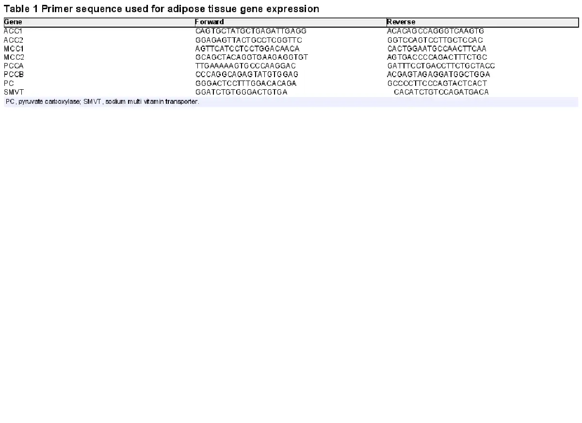 Total RNA was extracted from stored tissues by using the RNeasy total RNA Mini kit (QIAGEN) with one-column DNase digestion. RNA quality and concentration were assessed by using an Agilent 2100 Bioanalyzer (Agilent Technologies). An Illumina RNA amplification kit (Ambion) was used according to the manufacturer’s instructions to obtain biotin-labelled complementary RNA from 250 ng total RNA. Hybridisation processes were performed with Illumina Human HT-12 V.4.0 Expression BeadChips (Illumina). Hybridised probes were detected with cyanin-3-streptavidin (1 mg/mL; Amersham Biosciences, GE Healthcare) and scanned by using an Illumina BeadArray Reader. Raw data were extracted with GenomeStudio V.2011.1 software by using the default settings and without any additional normalisation. The target genes on which this study focused were selected as biotin-related genes (SMVT, HLCS, BTD, ACACA, PCCB, PC, ACACB, PCCA, MCCC2), as well as selected inflammation-related genes (A2M, ADIPOQ, ANGPT1, CAECAM1, CCL13, CCL19, CCL2, CCL23, CCL5, CCL8, CXCL10, CXCL12, CXCL9, DCN, FTH1, IGFBP3, IGFBP4, IGFBP5, IGFBP6, IL18, IL18BP, MMP2, MMP9, PECAM1, SERPINE1, SFTPD, SPP1, TIMP1, TNFRSF11B, TNFRSF1A, TNFRSF1B, TNFSF113B, VCAM1).