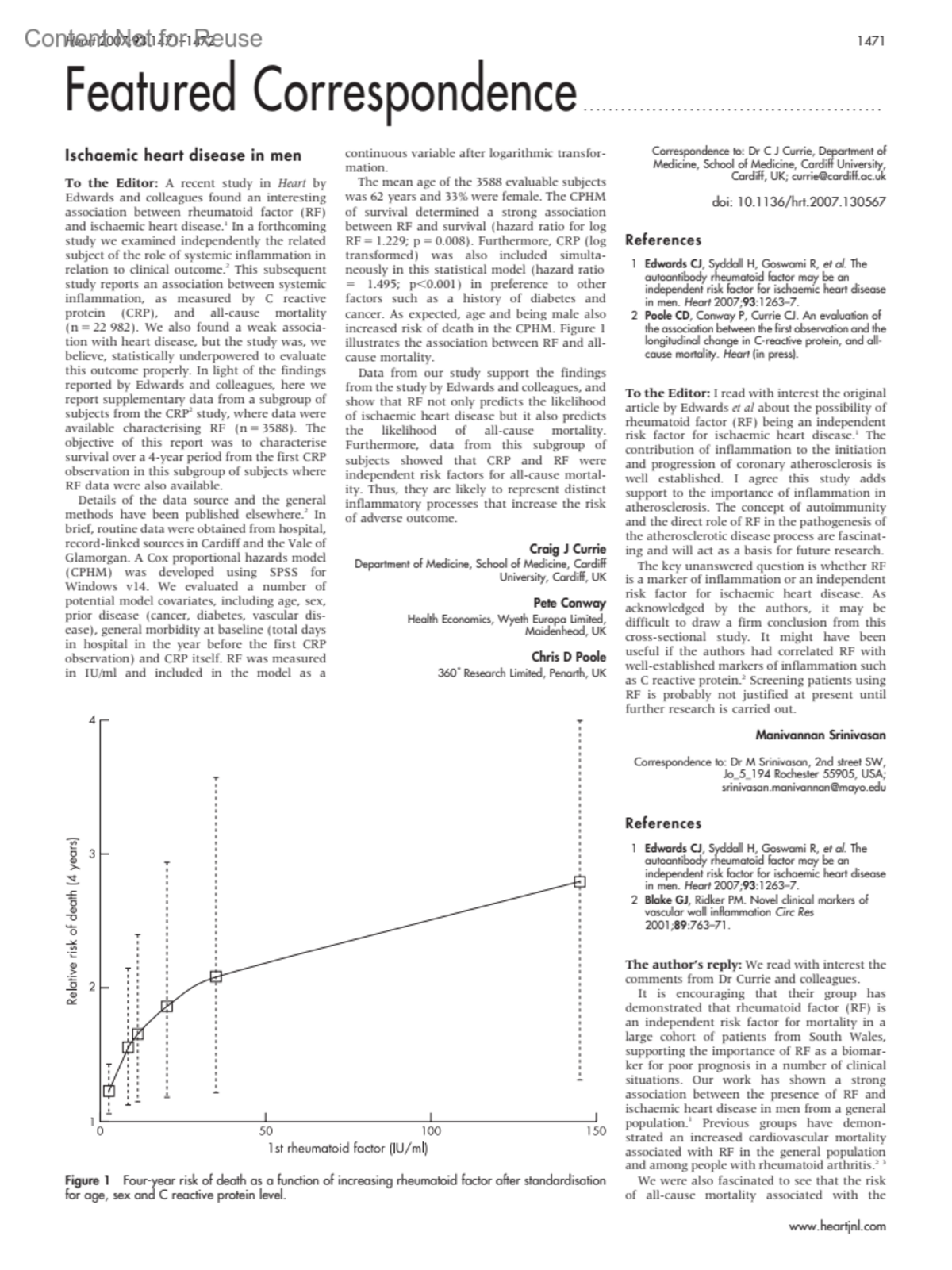 Ischaemic heart disease in menCurrie, Craig JConway, PetePoole, Chris DAuthor information1 Department of Medicine, School of Medicine, Cardiff University, Cardiff, UK2 Health Economics, Wyeth Europa Limited, Maidenhead, UK3 360° Research Limited, Penarth, UKCorrespondence to: Dr C J Currie Department of Medicine, School of Medicine, Cardiff University, Cardiff, UK; [email protected]Heart 93(11):p 1471, November 2007.Copyright © 2007 BMJ Publishing Group Ltd and the British Cardiac Society