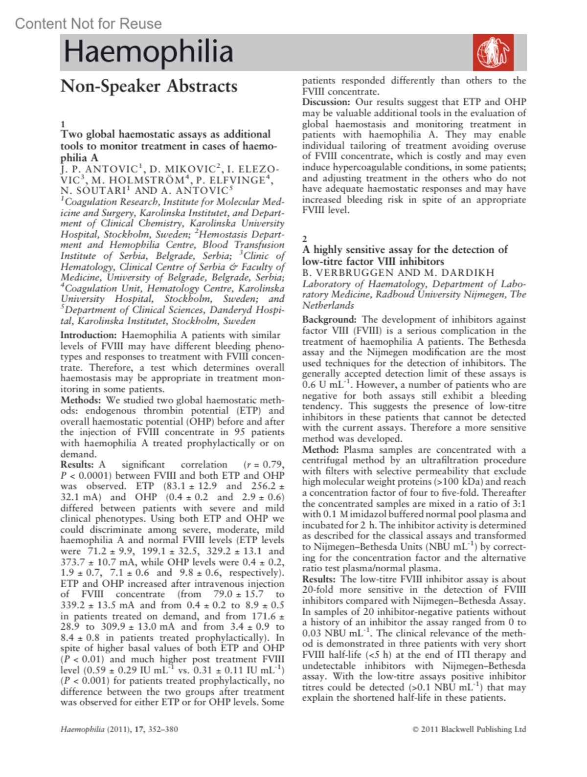 - 1Coagulation Research, Institute for Molecular Medicine and Surgery, Karolinska Institutet, and Department of Clinical Chemistry, Karolinska University Hospital, Stockholm, Sweden; 2Hemostasis Department and Hemophilia Centre, Blood Transfusion Institute of Serbia, Belgrade, Serbia; 3Clinic of Hematology, Clinical Centre of Serbia & Faculty of Medicine, University of Belgrade, Belgrade, Serbia; 4Coagulation Unit, Hematology Centre, Karolinska University Hospital, Stockholm, Sweden; and 5Department of Clinical Sciences, Danderyd Hospital, Karolinska Institutet, Stockholm, Sweden