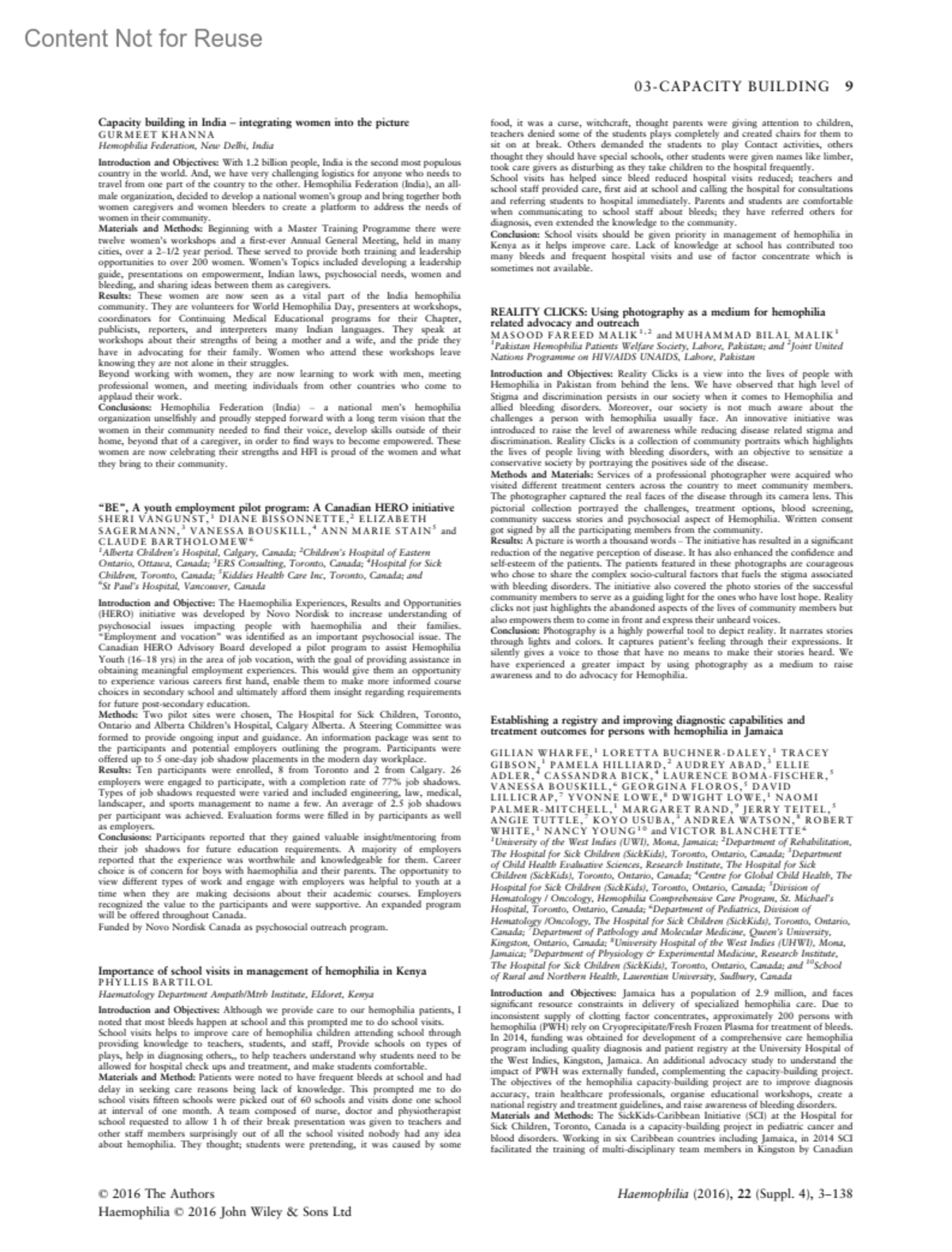 “BE”, A youth employment pilot program: A Canadian HERO initiativeVANGUNST, SHERIBISSONNETTE, DIANESAGERMANN, ELIZABETHBOUSKILL, VANESSASTAIN, ANN MARIEBARTHOLOMEW, CLAUDEAuthor information1Alberta Children's Hospital, Calgary, Canada;2Children's Hospital of Eastern Ontario, Ottawa, Canada;3ERS Consulting, Toronto, Canada;4Hospital for Sick Children, Toronto, Canada;5Kiddies Health Care Inc, Toronto, Canada; and6St Paul's Hospital, Vancouver, CanadaHaemophilia 22:p 9, July 2016.Copyright © 2016 John Wiley & Sons, Ltd