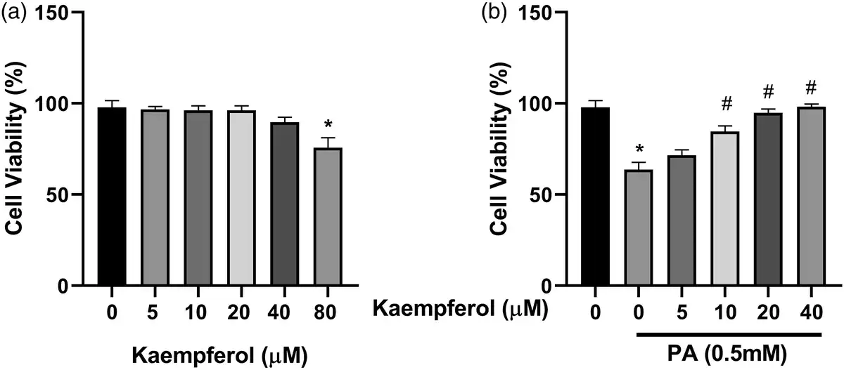 Effects of Kaempferol (KMF) and palmitate (PA) on cell viability. (a) Cell viability after treating with different doses of KMF and (b) combination of KMF and PA (0.5 mM). *p < 0.01 vs. control and #p < 0.01 vs. treatment with PA alone.