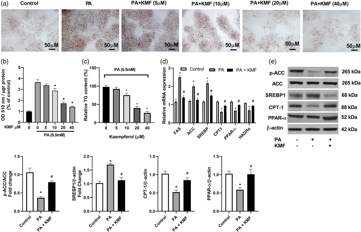 Effects of Kaempferol on PA-induced lipid deposition in HepG2 cells. (a, b) intracellular lipid content in HepG2 cells after treatment with different doses of KMF and PA (0.5 mM). (c) TG level following incubation with various doses of KMF and 0.5 mM PA for 24 h. (d) The relative mRNA expression of genes involved in lipid metabolism following treatment with KMF (20 μM) and 0.5 mM PA for 24 h. (e) The levels of p-ACC, CPT-1, PPAR-α and SREBP1 in the cells treated with KMF (20 μM) and 0.5 mM PA for 24 h. *p < 0.01 vs. control and #p < 0.01 vs. treatment with PA alone.
