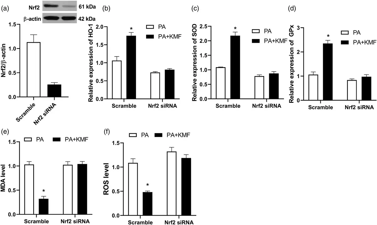 To evaluate whether Nrf2 activation had a significant role in KMF protection against PA-induced oxidative stress, we silenced Nrf2 using specific Nrf2 targeted siRNA. As shown in Figure 4(a), Nrf2 expression was significantly decreased after Nrf2 siRNA transfection. The ability of KMF to activate Nrf2 signaling was abolished by Nrf2 knockdown in HepG2 cells. The results showed that transfecting scramble siRNA led to increased expression of antioxidant genes such as HO-1, SOD and GPx in the cells treated with KMF (p < 0.01) (Figure 4(b)–(d)). However, KMF-mediated activation of the Nrf2 and its target genes was no found in the knockdown cells treated with PA. Furthermore, Nrf2 siRNA abolished the KMF-induced reduction in ROS and MDA levels in PA treated cells (Figure 4(e) and (f)).